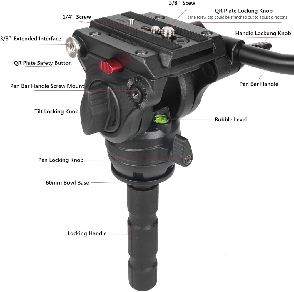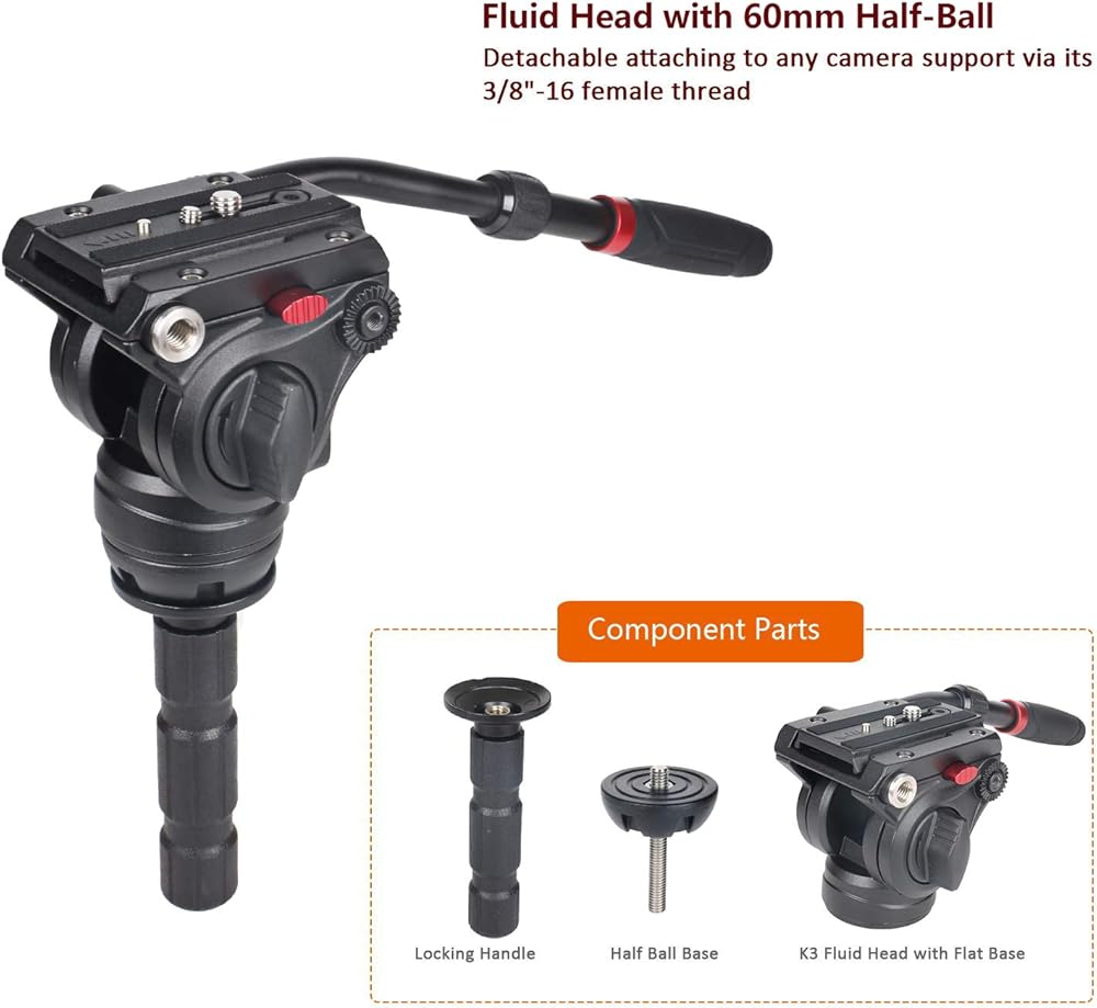 سعة تحميل 13 باوند | نطاق ارتفاع 33 انش إلى 72 انش | زاوية إمالة +90 درجة / -50 درجة | دوران 360 درجة | قطر الكرة 60 ملم | حقيبة حمل | رأس سائل | ساق حامل ثلاثي القوائم | قطعتان من ألواح الفك السريع.