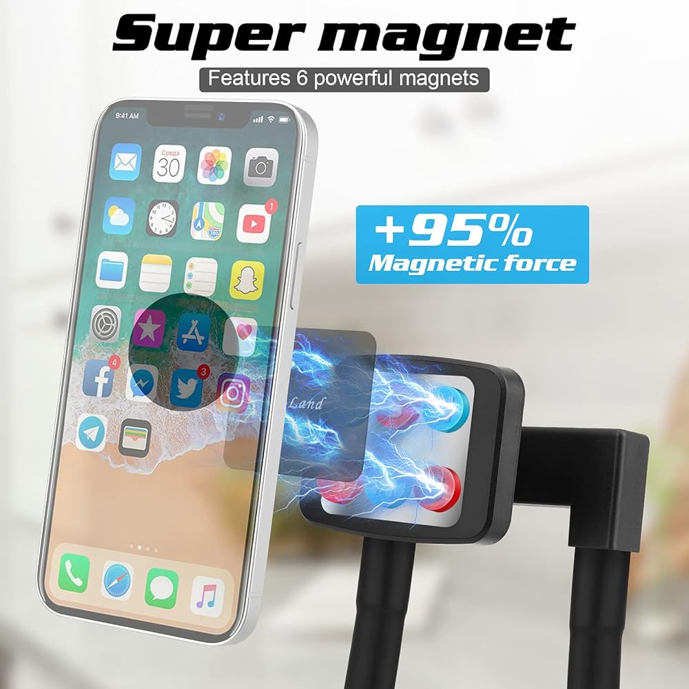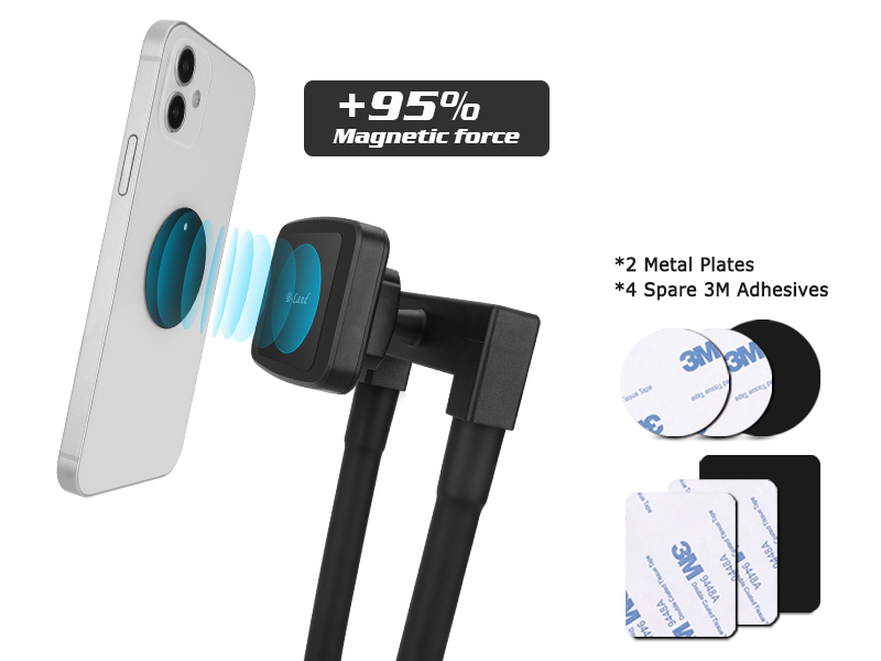 حامل هاتف مغناطيسي: يتميز حامل الهاتف المغناطيسي بـ 6 مغناطيسات قوية مدمجة في رأس التركيب مما يضمن بقاء هاتفك آمنًا عندما تستمتع بهاتفك بدون استخدام اليدين. يمكن تثبيت هاتفك الخلوي مغناطيسيًا بلوحة معدنية مثبتة مسبقًا على الظهر أو أي حافظة واقية. (قد تتداخل جرابات الهاتف الأكثر سمكًا مع الالتصاق المغناطيسي).