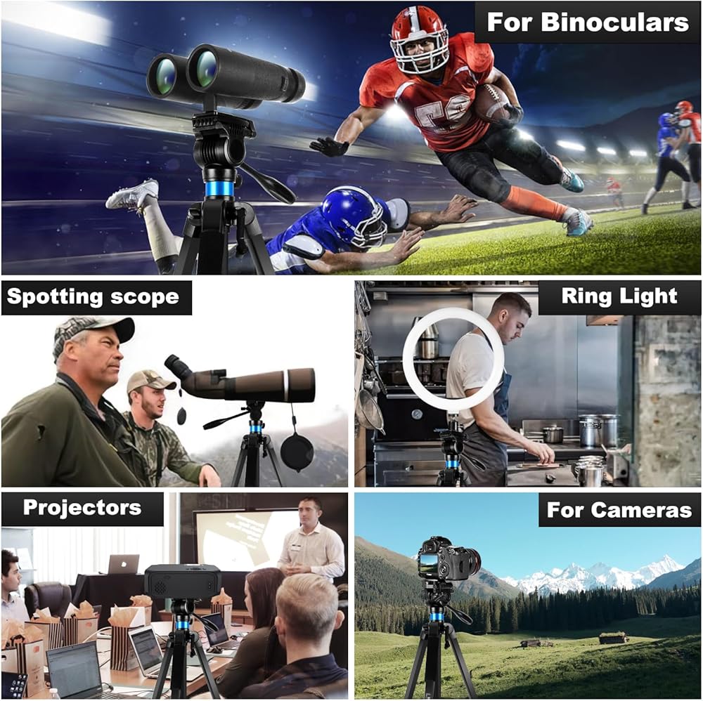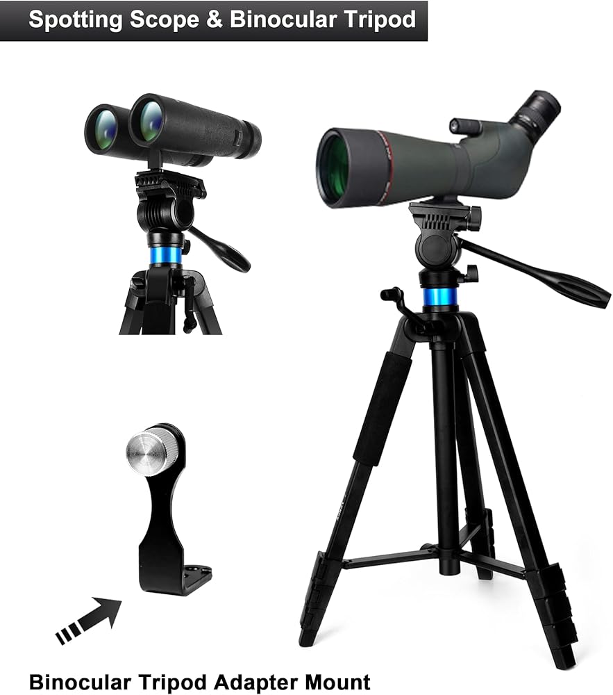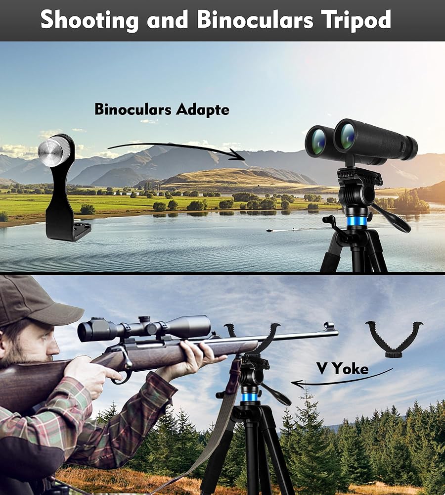 【High Compatibility】 Universal tripod, equipped with fluid head for removable 360° rotation and Hunting V Yoke and binoculars adapter mompatible with all binoculars, monocular, rifle, spotting scope, telescopes for astronomy, cameras, DSLR, camcorder, spotting scope, projector, webcam etc...
