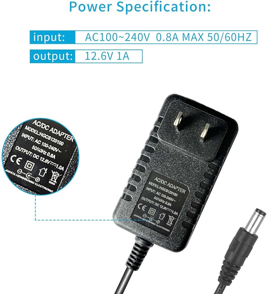 INPUT: 100-240V ~ 50/60Hz 0.8A . OUTPUT: DC 12.6V-1.0A