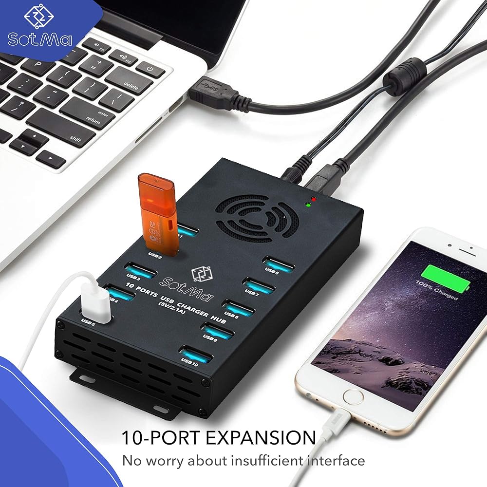 توصيلات USB متعددة: يحتوي مركز شحن USB الخاص بنا على 10 منافذ حتى تتمكن من توصيل جهاز الكمبيوتر والهاتف الذكي وقارئ البطاقات والأقراص الصلبة والمزيد! ضع مفتاح USB على مكتبك أو قم بتثبيته على الحائط.