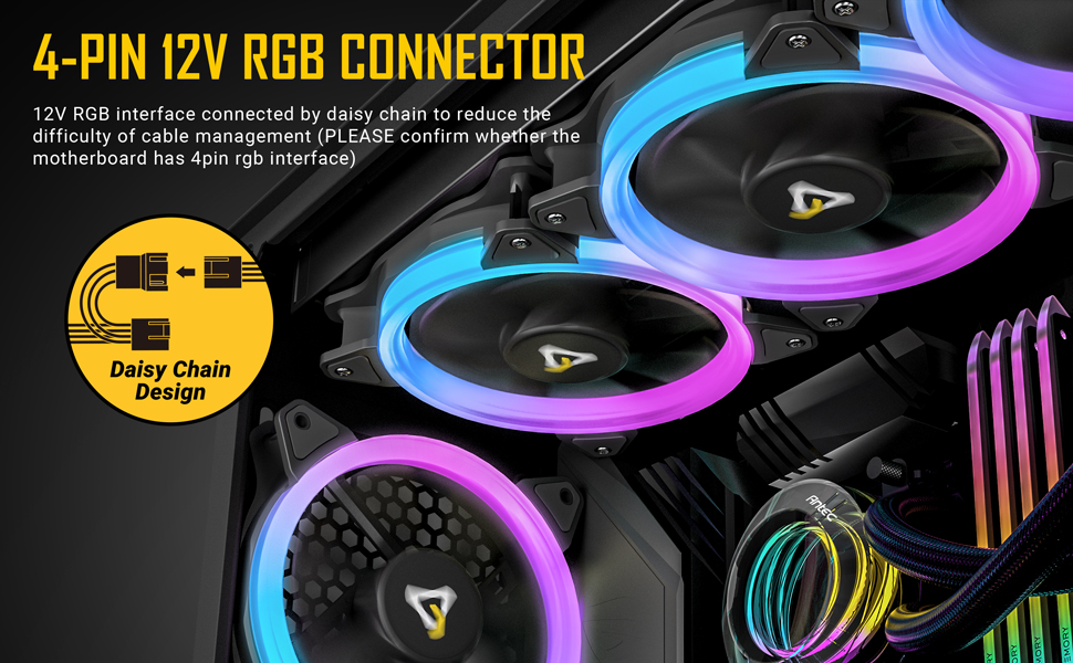 • موصل RGB 12 فولت بواسطة سلسلة ديزي لتقليل صعوبة إدارة الكابلات (يُرجى التأكد مما إذا كانت اللوحة الأم تحتوي على موصل RGB ذو 4 سنون)