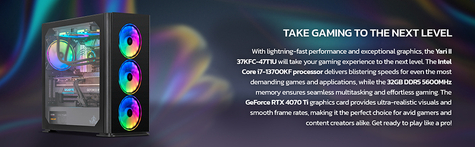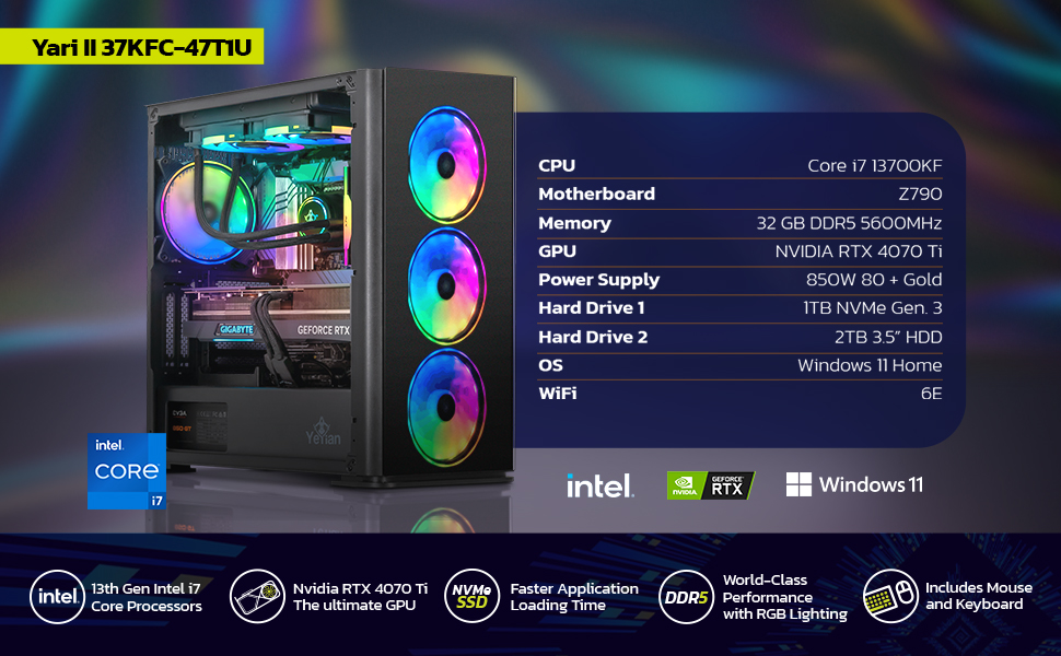 كمبيوتر مكتبي للألعاب YEYIAN Yari PC Xtreme VR، Intel Core i7-13700KF 5.4 جيجا هرتز، GeForce RTX 4070Ti 12 جيجا، 32 جيجا DDR5 5600 ميجا هرتز، 1 تيرابايت NVMe SSD، 2 تيرابايت HDD، WiFi & Win 11 Home، مراوح ARGB
