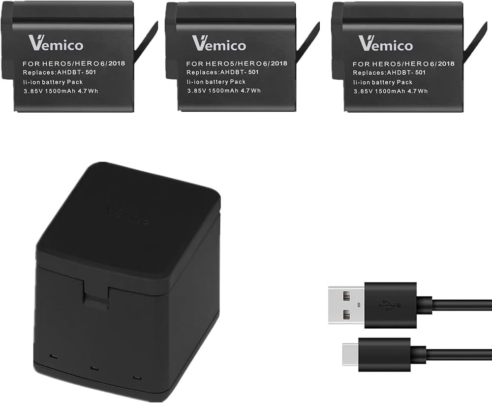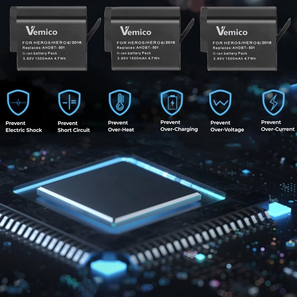 بطارية بديلة مطورة من Vemico Gopro Hero 7/6/5 بقدرة 1500 مللي أمبير في الساعة (3 عبوات) وشاحن USB ثلاثي القنوات LED من النوع C لـ Gopro Hero 7 Black/Hero 6/Hero 5/Hero 2018 أسود