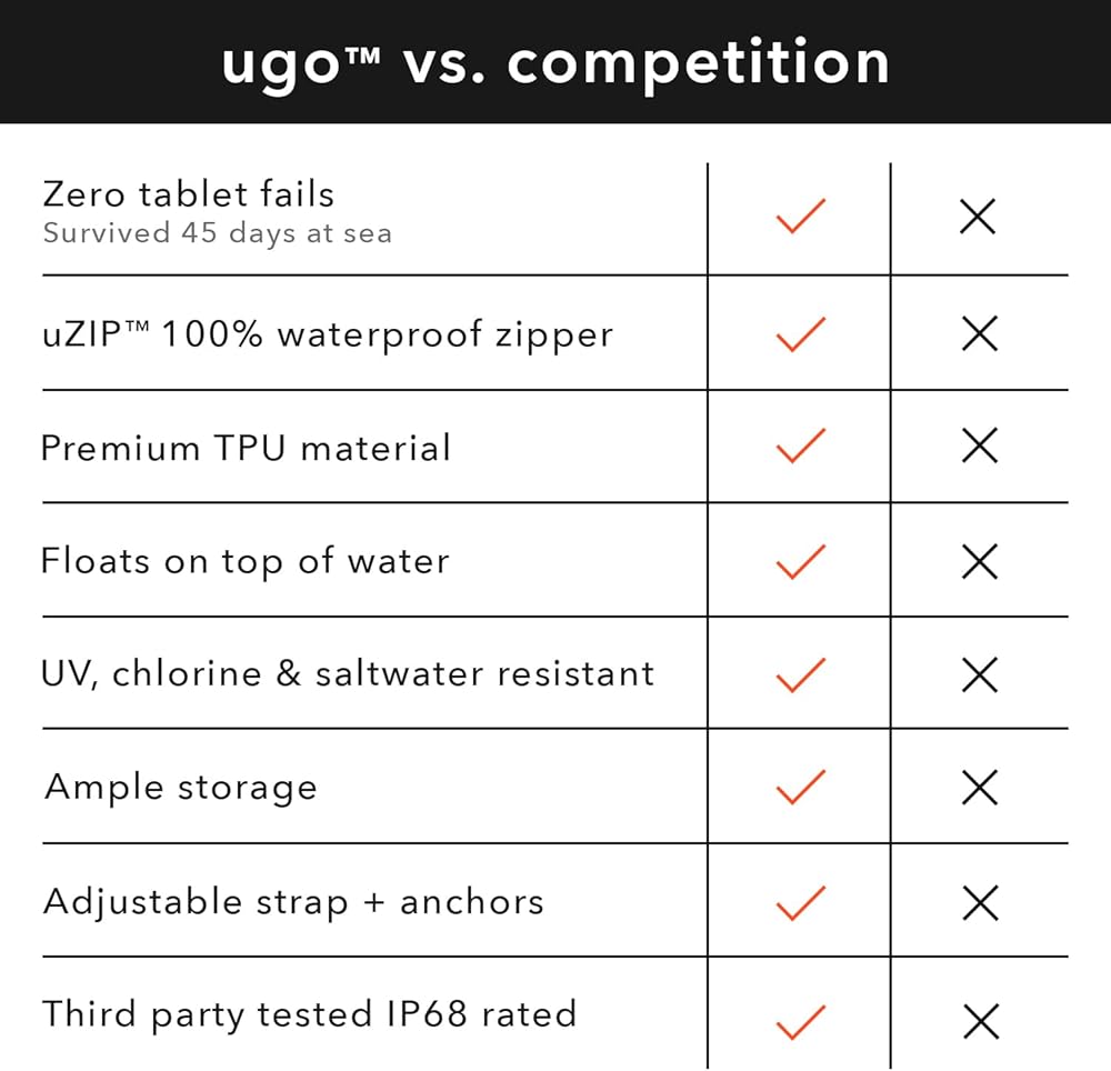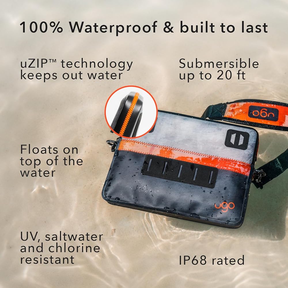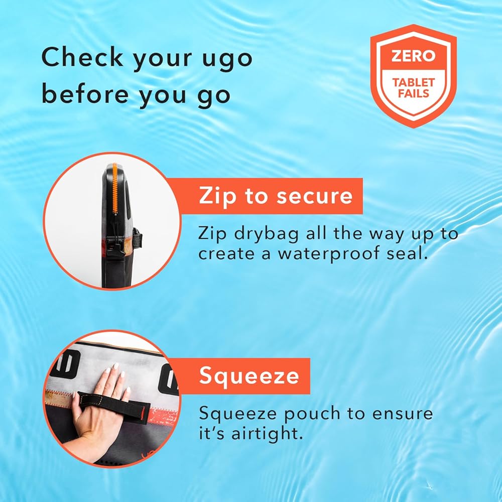 حافظة تابلت مقاومة للماء بالكامل - تم اختبار ugo بواسطة طرف ثالث، تصميم IP68 مقاوم للماء بنسبة 100% على عمق يصل إلى 20 قدمًا، بالإضافة إلى أنه مقاوم للرمل والغبار. غلاف TPU المتين ملحوم بتقنية RF بسحاب قفل ممتاز تم تصميمه في الأصل لتوفير الحماية القصوى في ملابس السباحة.