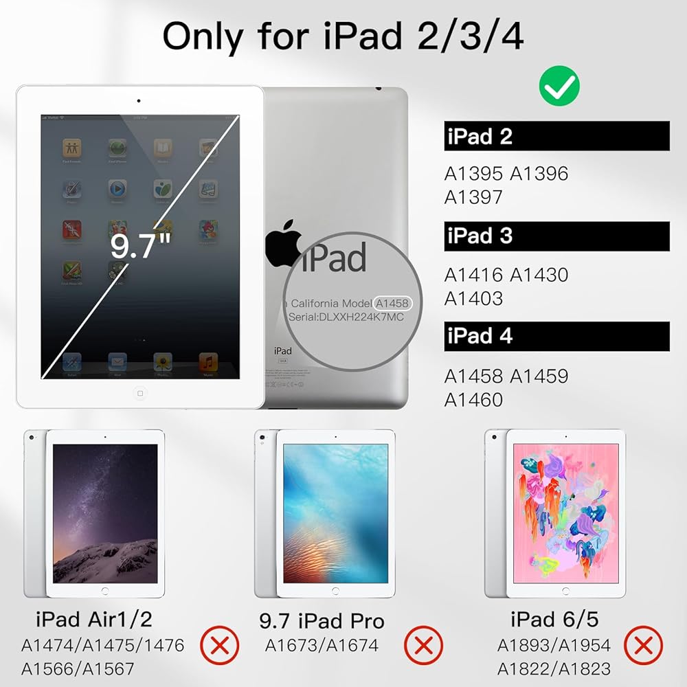 مصممة لباد 2/3/4. ليس لجهاز iPad الأحدث مثل iPad mini، iPad Air، iPad Pro، وليس لأحدث 2017 iPad 9.7 بوصة. تناسب موديلات iPad: A1395/A1396/A1397/A1416/A1430/A1403/A1458/A1459/A1460. يرجى التحقق من الجزء السفلي من جهاز iPad الخاص بك للعثور على رقم الطراز