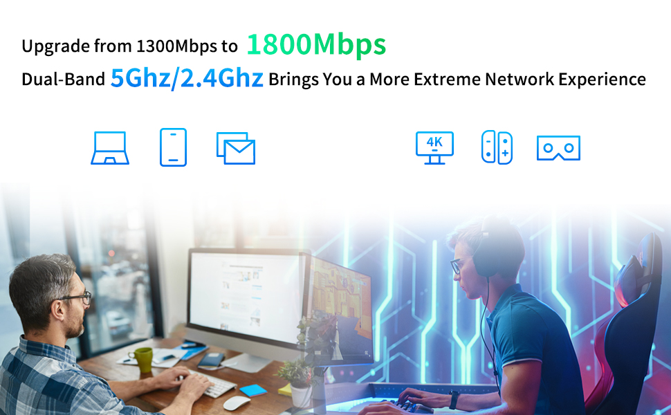 ⭐【محول واي فاي USB ثنائي النطاق 1800 ميجابت في الثانية】سرعة محول واي فاي AX1800 تصل إلى 1201 ميجابت في الثانية على 5 جيجاهرتز و573.5 ميجابت في الثانية على 2.4 جيجاهرتز، توفر الشريحة المتقدمة RTL8832AU تجربة شبكة أفضل ولها معدل نقل أسرع من محولات واي فاي الأخرى، مناسبة لـ FPS عبر الإنترنت الألعاب ومشاهدة بث الفيديو عالي الدقة والاجتماعات الافتراضية.