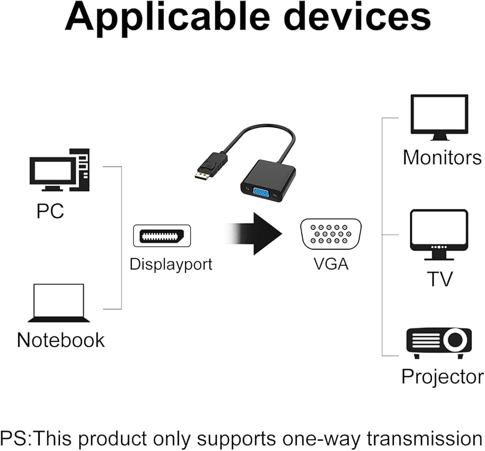 قم بتحويل إشارة منفذ العرض إلى إشارة VGA. يرجى ملاحظة أن هذا محول أحادي الاتجاه ولا يمكنه تحويل إشارة VGA إلى إشارة منفذ العرض.