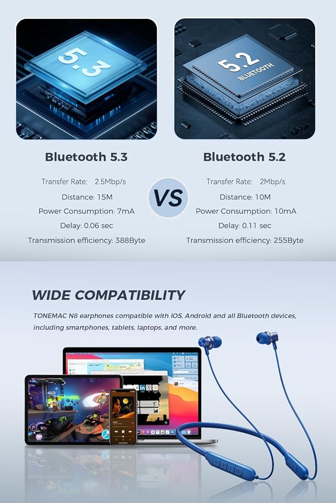 【 بلوتوث 5.3 متقدم 】استمتع بإقران أسرع، واتصالات أكثر استقرارًا، وعمر بطارية أطول، ونقل صوتي عالي الجودة مع أحدث شريحة بلوتوث 5.3.