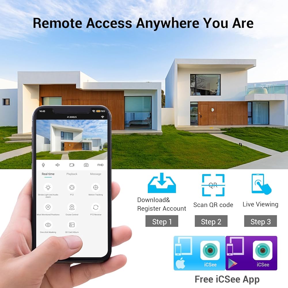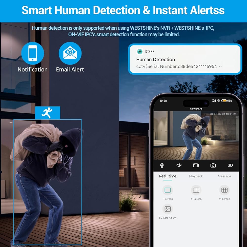 أمان أكثر ذكاءً: اضبط مناطق كشف الحركة والحساسية، واستقبل تنبيهات البريد الإلكتروني/الهاتف، ومراجعة اللقطات عبر تطبيق ICSEE للهاتف الذكي. راقب الكاميرا الخاصة بك على جهاز كمبيوتر باستخدام برنامج VMS/CMS أو متصفحات متعددة على نظام التشغيل Windows (Chrome/Firefox/Microsoft Edge). متوافق مع أجهزة WESTSHINE NVR ومعظم أجهزة NVR ذات العلامات التجارية التابعة لجهات خارجية.