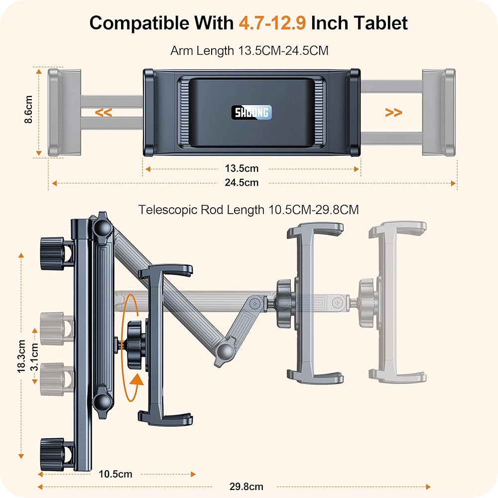 💝【متوافق مع 4.7-12.9 بوصة، مناسب لأجهزة الكمبيوتر اللوحية بنسبة 99%】 الطول التليسكوبي لذراع المشبك هو 13.5 سم - 24.5 سم، ✅ويمكن استخدام طول أو عرض الجهاز ضمن هذا النطاق. على سبيل المثال، للكمبيوتر اللوحي Amazon Fire HD 8/الكمبيوتر اللوحي Fire HD 10/الكمبيوتر اللوحي Fire 7؛ لابل آي باد 1 2 3 4 5 / آي باد برو 9.7 / 10.2 / 10.5 / 12.9/ آي باد إير 1/2 / آي باد ميني 1 2 3 4 ؛ لجهاز سامسونج جالاكسي تاب A/S؛ سوني؛ Nintendo Switch، وما إلى ذلك. ❗ملاحظة: لا يمكن استخدام مشغلات DVD المحمولة!