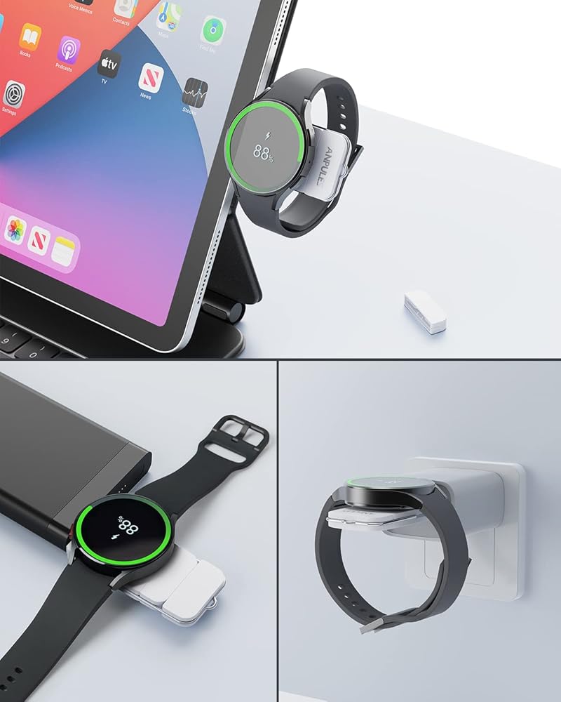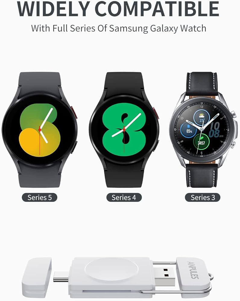 【شاحن ساعة ذكية مطور لساعة سامسونج】هذا الشاحن المحمول متوافق مع ساعة سامسونج جالكسي 6/6 كلاسيك/5/5 برو/4/4 كلاسيك/ساعة جالكسي 3/جالكسي اكتيف 2/ساعة جالكسي اكتيف. يدعم شاحن ساعة انبوليز ساعات سامسونج إلى أقصى حد، فهو يقوم بتحديث وتحديث شريحة الشحن تلقائيًا. لذلك يمكنك شرائه دون قلق. يمكن استخدام أحدث تقنيات الشحن العكسي او تي جي مع الهواتف المحمولة لشحن ساعتك.