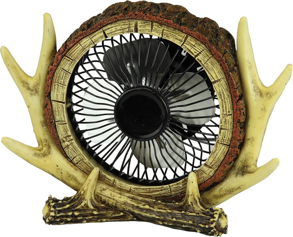 مروحة تعمل بالطاقة USB بقطر 4 بوصات في سجل من خشب الصنوبر والبوليستر المطلي يدويًا وعلبة قرن الوعل. ما عليك سوى توصيل الكابل الطويل مقاس 32 بوصة بمنفذ USB بجهاز الكمبيوتر الخاص بك وتشغيله/إيقاف تشغيله باستخدام مفتاح Rocker الموجود في الخلف.