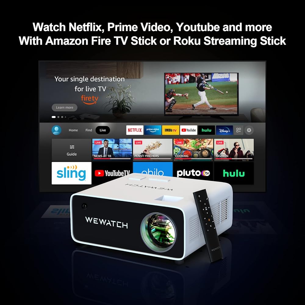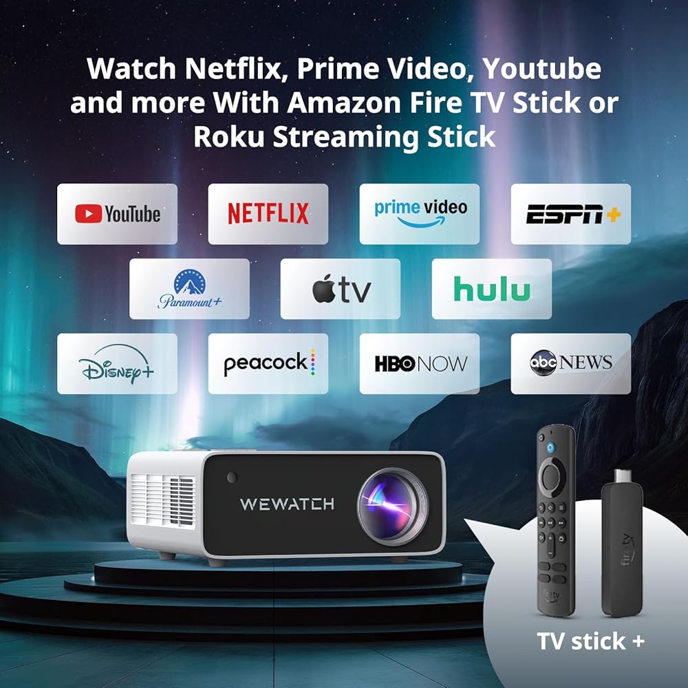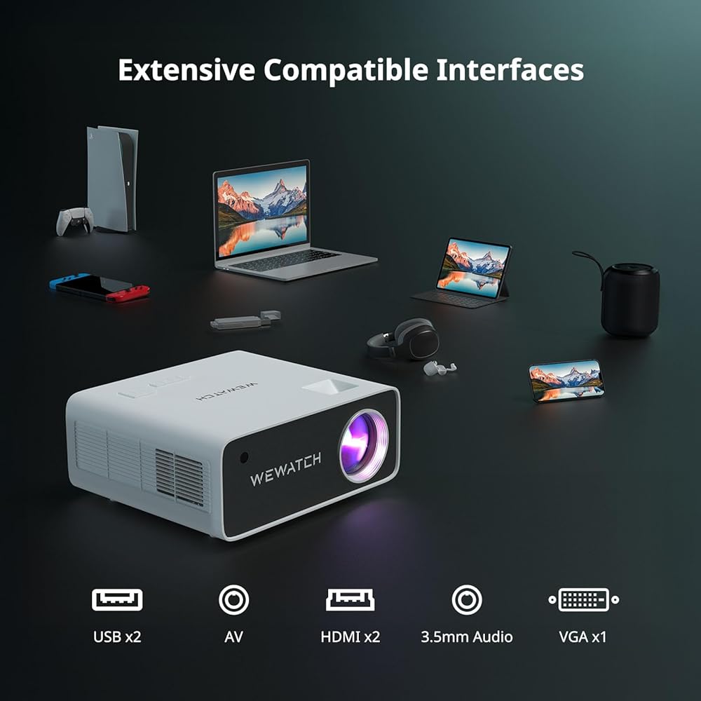 【جهاز عرض WIFI 5G/2.4G واتصال بلوتوث 】 يمكن لجهاز عرض الفيديو اللاسلكي WEWATCH V70 مزامنة شاشة هاتفك الذكي عبر كل من 2.4G و5G WiFi. ما عليك سوى الاستمتاع بمئات الملايين من موارد بث الفيديو عبر الإنترنت. من خلال اتصال Bluetooth، يمكنك الاتصال بمختلف مكبرات الصوت وسماعات الرأس التي تعمل بتقنية Bluetooth. كما يمكن لجهاز العرض V70 أن يدعم إخراج HDMI / USB / VGA / AV / الصوت 3.5 مم. يمكنك بسهولة توصيل الهاتف الذكي، iPad، الكمبيوتر المحمول/الكمبيوتر الشخصي، PS4، مشغل DVD، عصا التلفاز، محرك USB