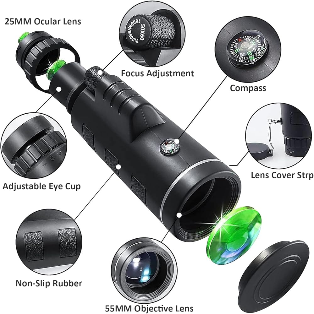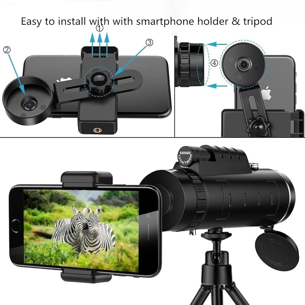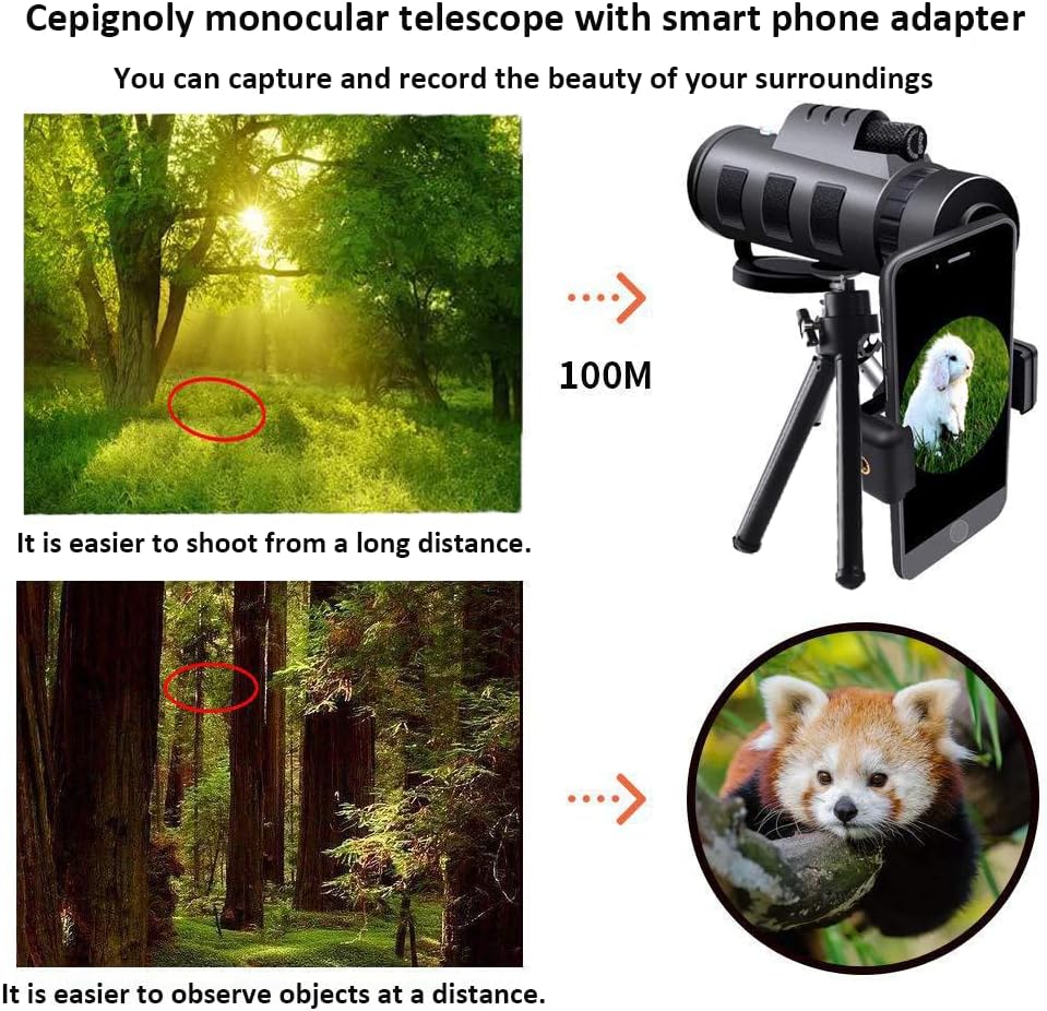 Size Name: Monocular Telescope 12x50 Magnification: 12 Objective Diameter: 50mm Material: corrugated rubber & engineering plastics Prism Type: BAK-4 - field of view: 430 ft (@ 1000 yds) Packages: 1 x Monocular telescope 1 x Smartphone Holder 1 x Waterproof Bag 1 x Cleaning Cloth 1 x Phone Bracker Cover 1 x 19cm Tripod 1 x Hand Strap 1 x Eye Cup 1 x Lens Cover 1 x User Manual Are you looking for the clearest visual effect from Monocular telescopes? 1) The zoom Monocular is coated and sealed with an FMC multi-layered broadband green film to ensure luminousness up to 99. 9%. 2) The monocular telescope is crafted with an internal BAK4 Prism, as well as an FMC-multi coated lens, providing visual fidelity and excellent light sources for sporting events, concerts, bird watching, hunting, hiking, camping, fishing and traveling. It is not just a telescope for adults, but also for kids. 3) Telescope's durable framework makes it usable for the toughest weather conditions. Rubber armor makes it comfortable for use and keeps it from slipping out. as long as the phone camera is aligned with the center of the holder, no matter how much the phone moves, the vision will not be blocked. if you want the image to fill the entire screen, you must zoom in by hand. 4) Our monocular has Day & Low Night Vision, it could help you see things in the day and light 5)Our Day & Low Night Vision Monocular Telescope has Shockproof, Waterproof, Fog Proof & dustproof to make sure that is durable. 6)Widely Compatible with Smartphone. Easy to install, remote control monocular.