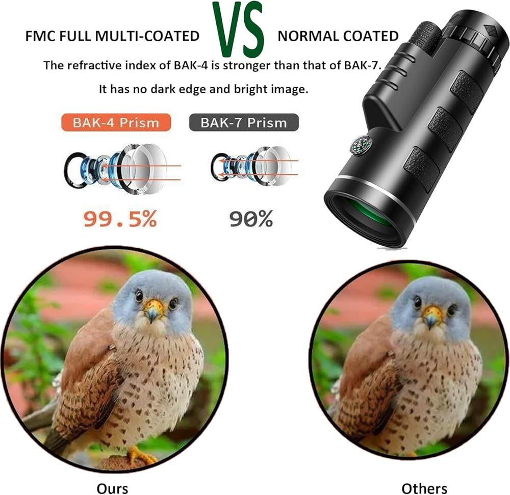 • ✅【High Contrast and Resolution Images】 Latest optics technology, the HD monocular telescope equipped with BAK-4 prism and fully multi-coated lens, superior light transmission and brightness and the light transmittance reaches up to 99. 5%. Our monocular has low-light-level night vision, it could help you see things in low light (can't see anything in complete darkness), provide you a amazing viewing experience.