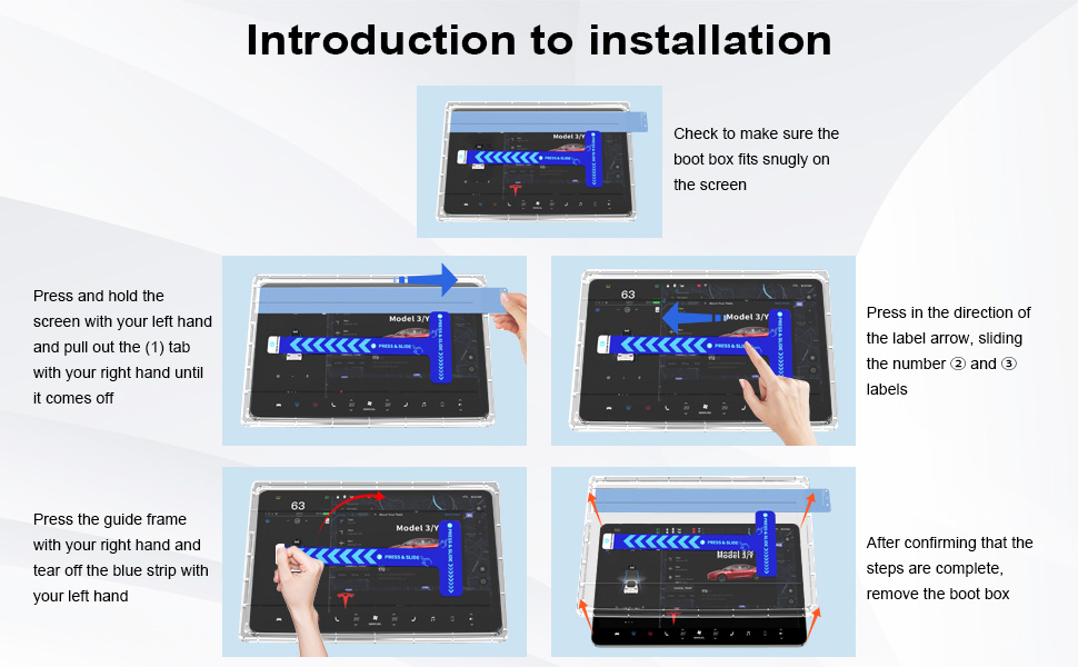 واقي شاشة تيسلا سهل التركيب: سهل التركيب. يمكن امتصاص إطار التثبيت تلقائيًا على الشاشة، ويمكن ضغط الفقاعات الموجودة على السطح تلقائيًا وإزالتها أثناء عملية التثبيت، دون ترك أي فقاعات.