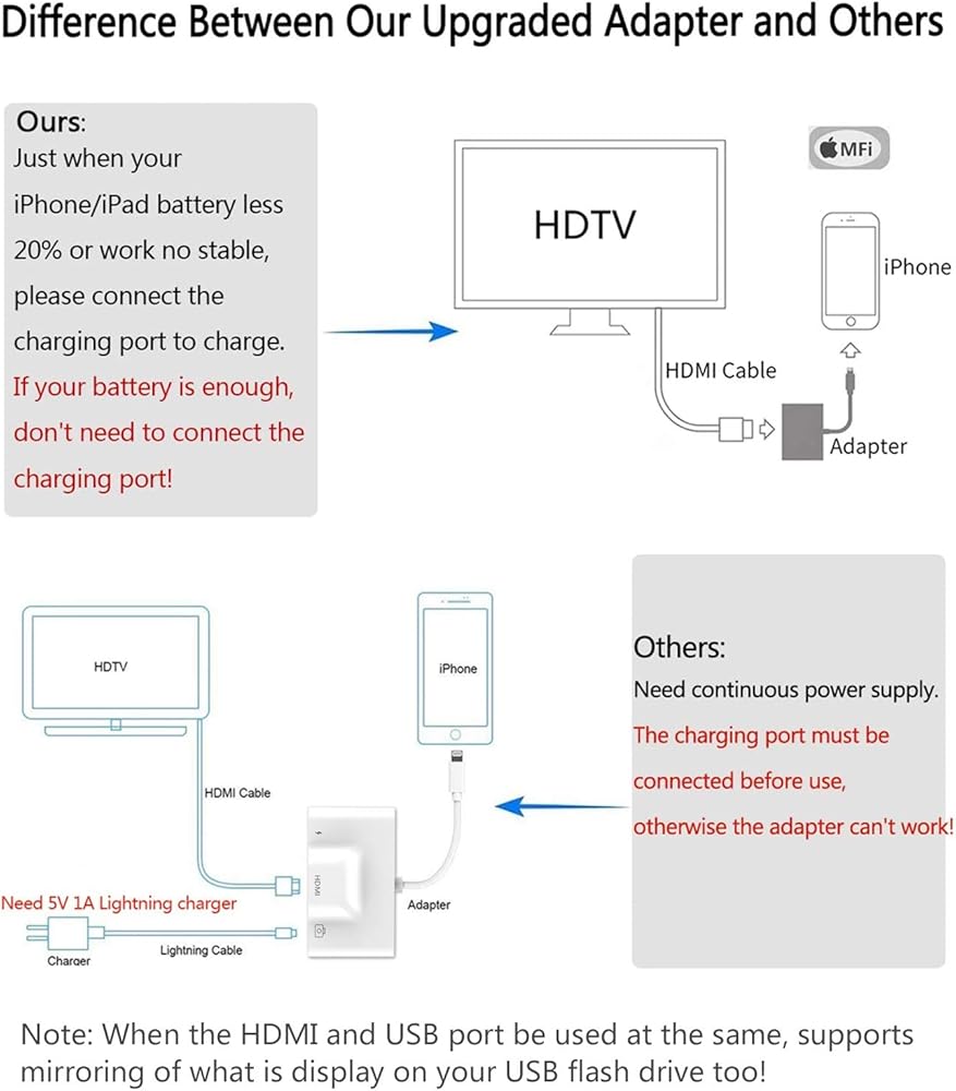 1. يمكن أيضًا استخدام منفذ HDMI ومنفذ USB في نفس الوقت! (ملاحظة: المحول المطور الخاص بنا فقط عندما تكون بطارية ايفون أقل بنسبة 20% أو تعمل بشكل غير مستقر، يرجى توصيل منفذ الشحن للشحن. إذا كانت بطاريتك كافية، فلا تحتاج إلى توصيل منفذ الشحن!)