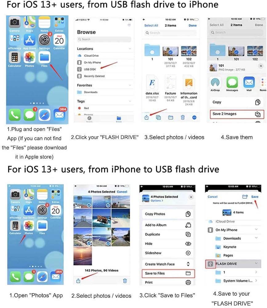 1. لمستخدمي iOS 9.2-12.4، يدعم النقل أحادي الاتجاه من ذاكرة فلاش USB إلى ايفون/ايباد. عند توصيل ذاكرة فلاش USB، سيعمل جهاز ايفون/ايباد الخاص بك
