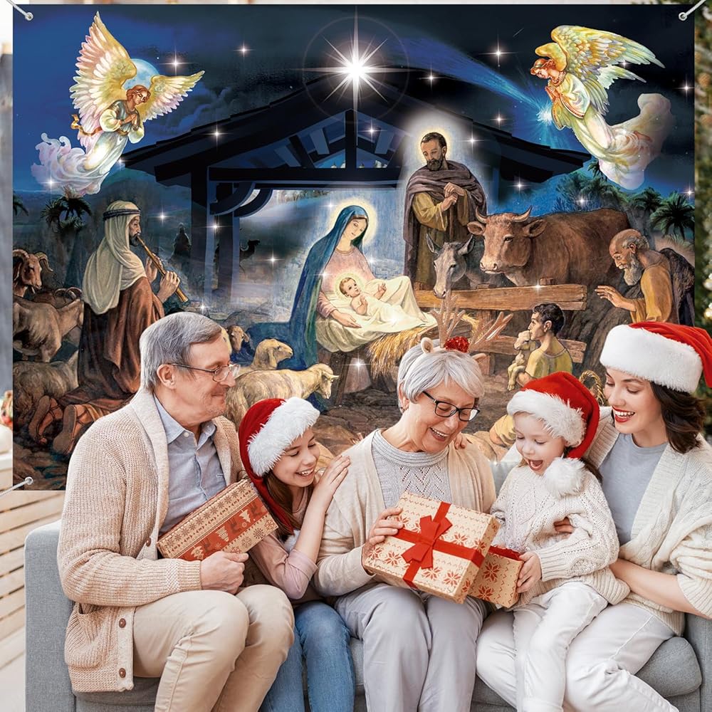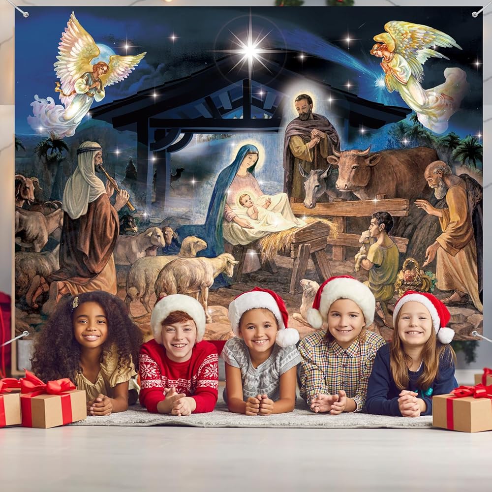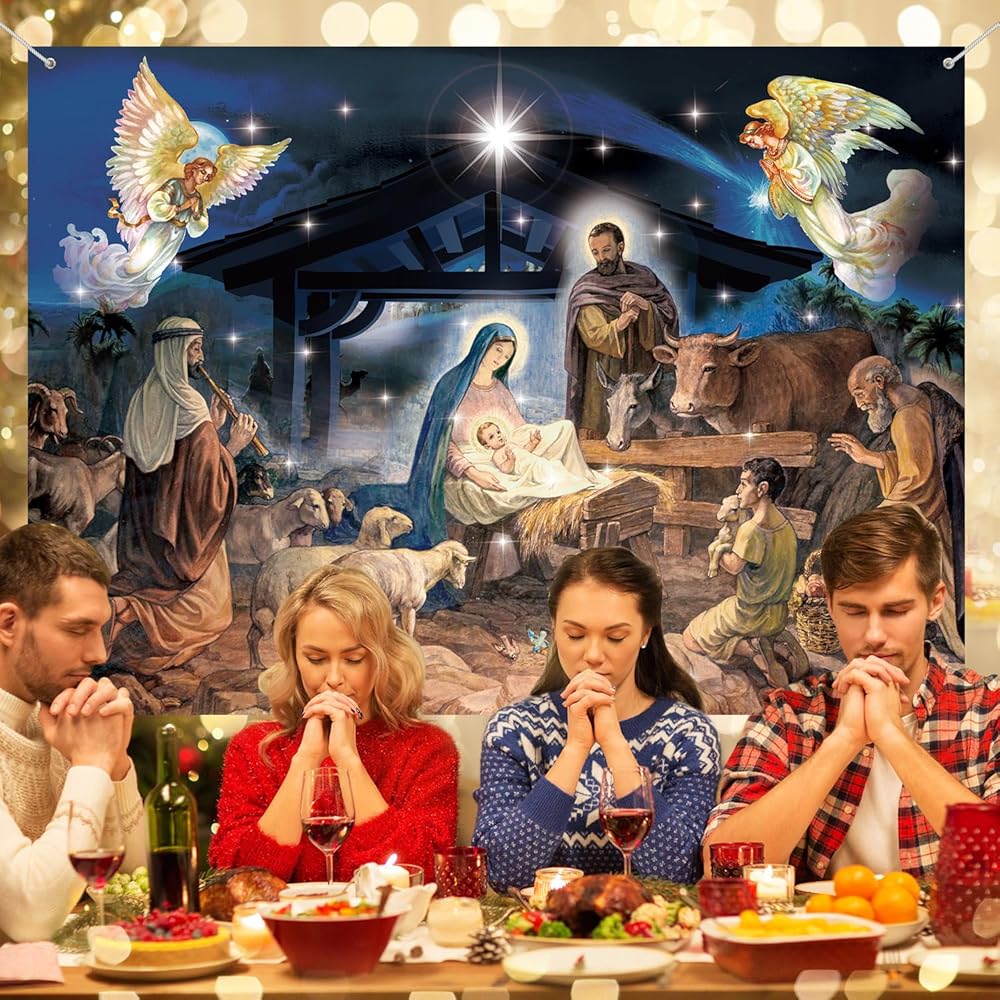 تصميم ديني لعيد الميلاد: تتميز خلفية عيد الميلاد في العصور الوسطى هذه بمشهد ميلاد، مناسبة لم شمل عائلة عيد الميلاد، والتي يمكن أن تكون حديث التجمع وتثير إعجاب ضيوفك لأن لافتة الخلفية الجميلة هذه تضيء حفلتك