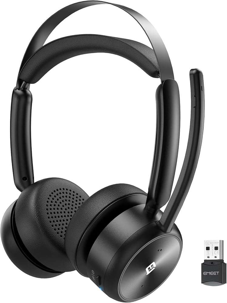 سماعة رأس لاسلكية EMEET مع ميكروفون، سماعات بلوتوث HS80 مع ميكروفون لإلغاء الضوضاء، وقت عمل 46 ساعة، زر كتم الصوت، دونجل لاسلكي 2.4 جيجا، سماعة رأس لاسلكية للكمبيوتر/المكتب/مركز الاتصال/التكبير/التصغير/سكايب