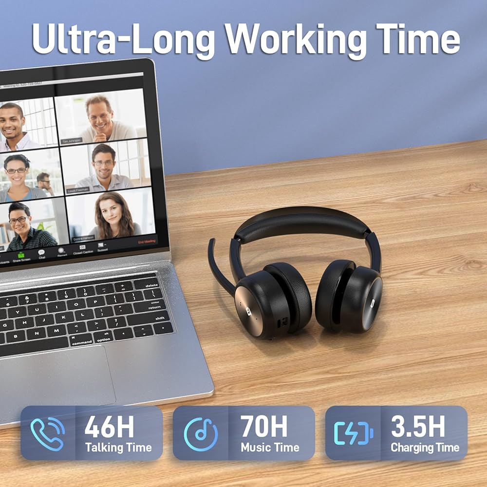 [وقت عمل طويل، شحن سلس] يتم تشغيل سماعة الرأس اللاسلكية ببطارية 1000 مللي أمبير في الساعة، مما يوفر 46 ساعة من وقت التحدث و70 ساعة من تشغيل الموسيقى. عند توصيلها عبر كابل USB، يمكن استخدام سماعة الرأس اللاسلكية أثناء الشحن. وهذا يجعله مثاليًا لأولئك الذين يحتاجون إلى استخدام ممتد، سواء كانوا يعملون عن بعد من المنزل أو في مركز الاتصال.