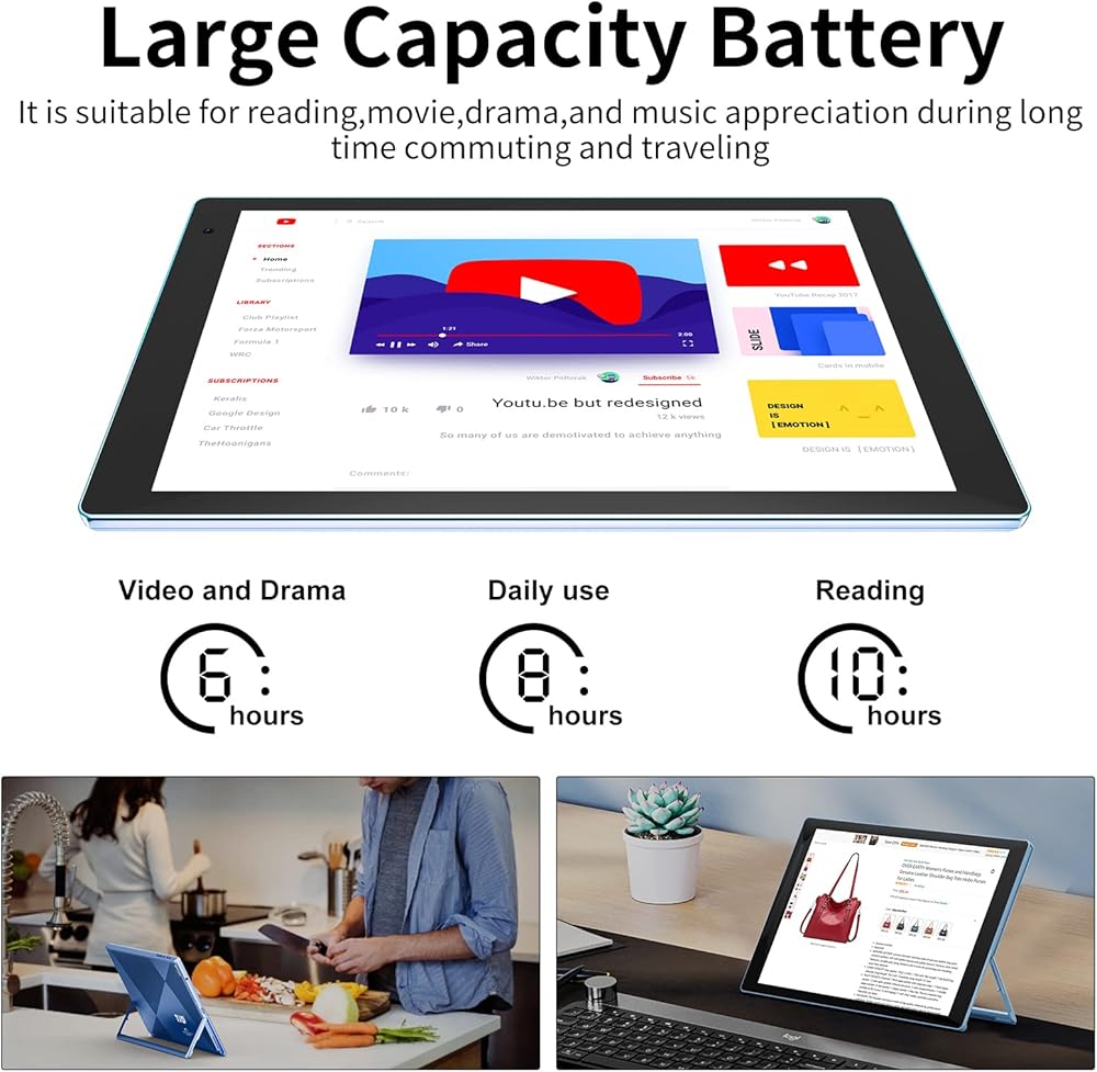 • بطارية ذات سعة كبيرة وترفيه رائع - مجهزة بسعة تخزين ROM تبلغ 128 جيجابايت تدعم معظم سعة 512 جيجابايت مثالية للطلاب والكاتب والأطفال. بطارية مدمجة قابلة لإعادة الشحن بقدرة 6000 مللي أمبير في الساعة تتيح حوالي 8 ساعات من الاستخدام المختلط لقراءة الكتب الإلكترونية أو الاستماع إلى الموسيقى أو مشاهدة الأفلام أو ممارسة الألعاب أو تصفح موقع الويب، سيكون هذا الجهاز اللوحي خيارًا مثاليًا.