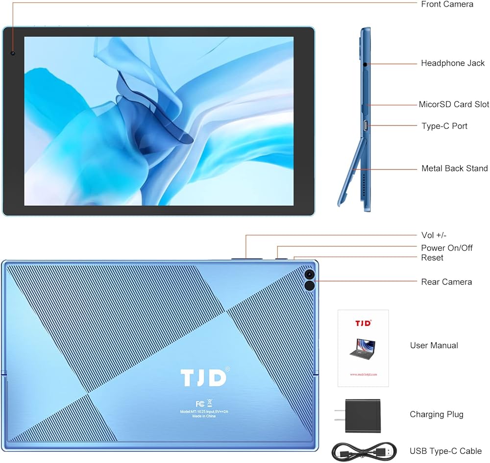 • تصميم حامل حاصل على براءة اختراع - يتميز TJD Tablet android بتصميم حامل خلفي معدني فريد حاصل على براءة اختراع، في حالة الفيديو أو الكتابة أو الطبخ حسب الرغبة، زيادة تجربة الاستخدام بشكل أفضل. يتم تثبيت الفيلم المقسى على الجهاز اللوحي. إنه مزود بتقنية 2.4G/5G WiFi6، وBluetooth 5.0، وتم تثبيت Google Play مسبقًا، واستمتع بتطبيقاتك المفضلة مثل Netflix وTwitter وInstagram وTiktok وما إلى ذلك بقدر ما تريد.