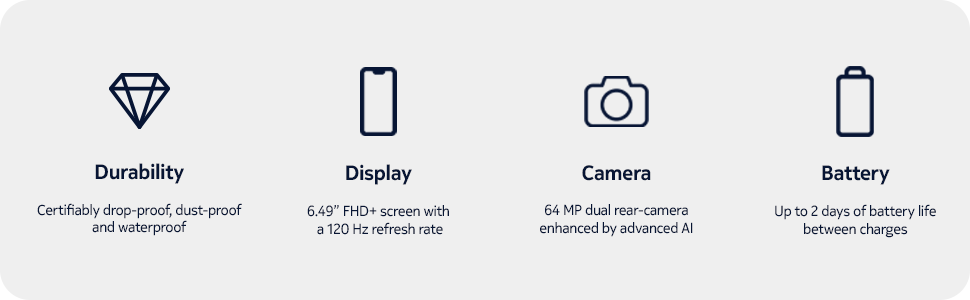 • الارتقاء بـ "مقاومة الحياة" إلى المستوى التالي من خلال هيكل من الألومنيوم المعاد تدويره بنسبة 100% وتم اختباره وفقًا لمعايير MIL-STD-810H وIP69K ليكون مقاومًا للغبار ومقاومًا للماء ومقاومًا للسقوط حتى 1.8 مترًا بفضل زجاج كورنينج غوريلا القوي. شاشة Victus وعدسة الكاميرا.