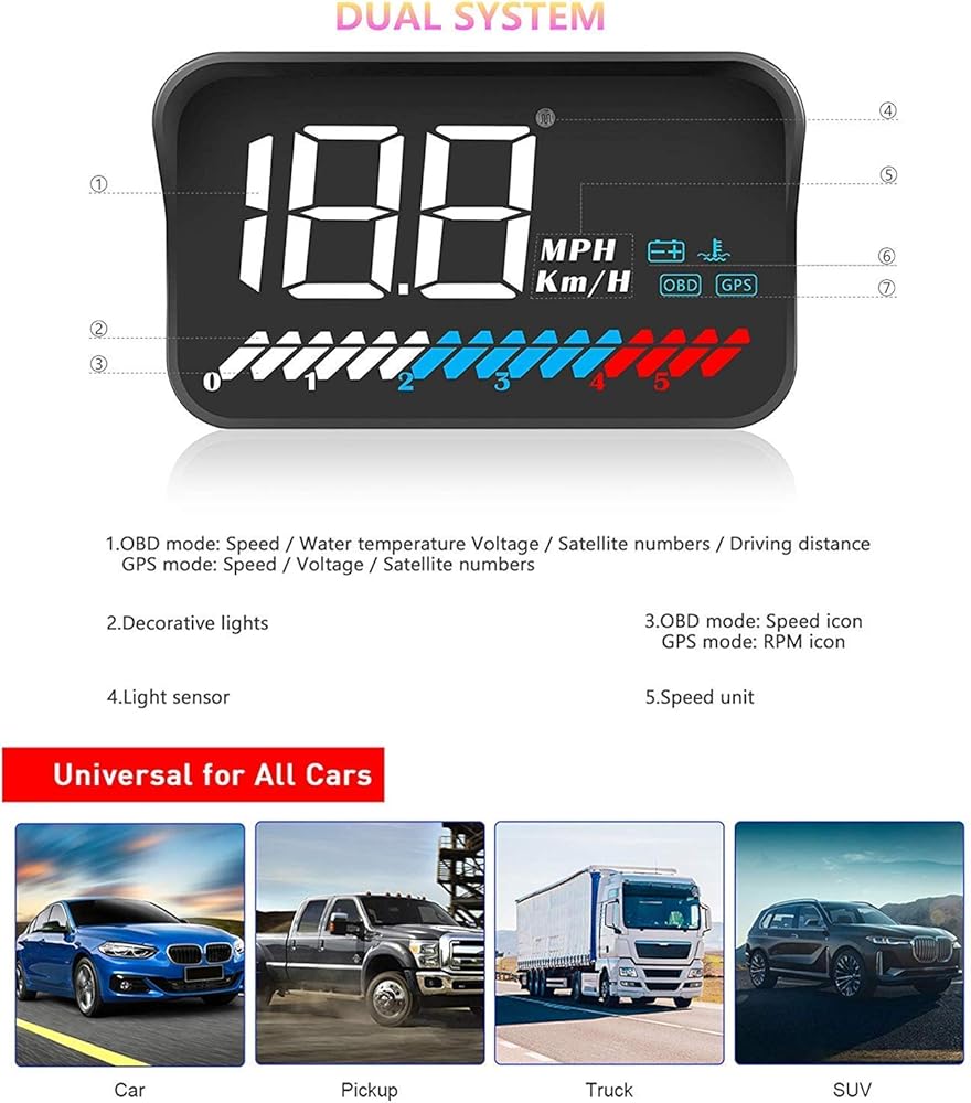 سيارة عالمية نظام مزدوج HUD Head Up Display OBD II/GPS ، سرعة السيارة MPH KM/H ، RPM المحرك، تحذير السرعة الزائدة ، قياس الأميال ، درجة حرارة الماء ، الجهد