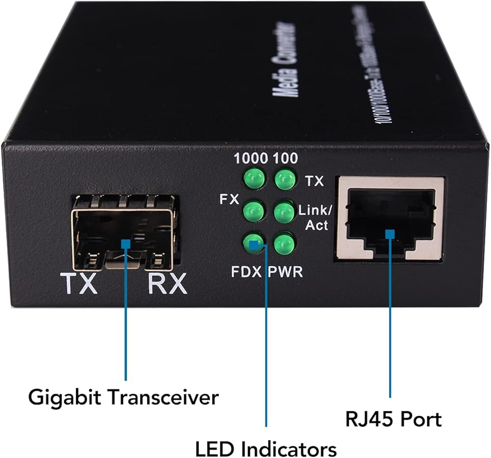 1. معدل بيانات المنفذ البصري: 1.25 جيجابت في الثانية، 10/100/1000Base-Tx إلى 1000Base-LX SFP محول وسائط جيجابت من الألياف