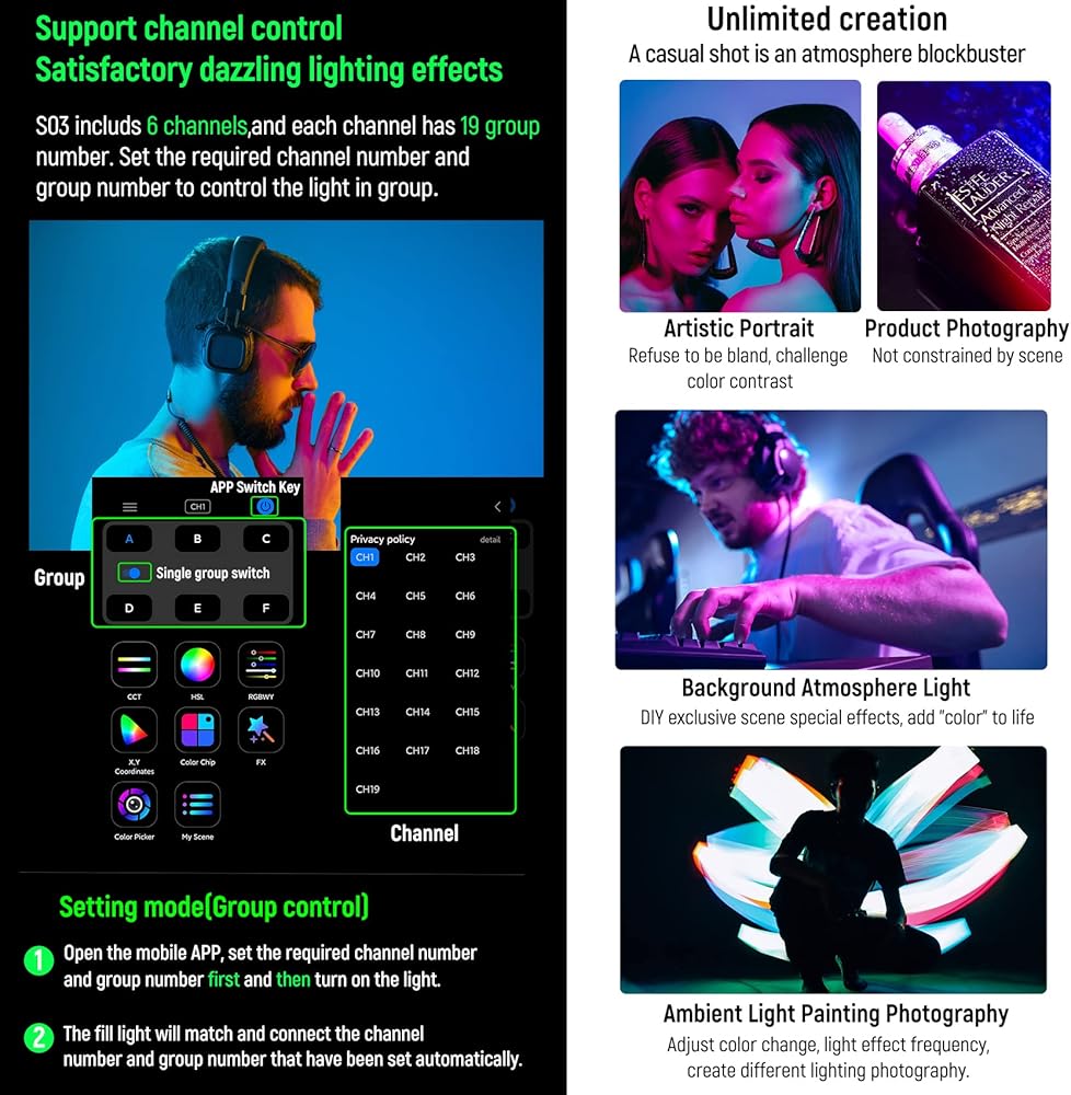 ☆ 【أوضاع CCT/RGB/SCENE مخصصة】يمكن لمصباح الفيديو S03 RGB بما في ذلك تنسيق HSI/RGBWY وX & Y وما إلى ذلك من أوضاع RGB أن يتطابق مع ملايين الألوان لإثراء إضاءة التصوير الفوتوغرافي الخاصة بك وسيوفر السطوع الخافت بنسبة 0-100% الأفضل الاختيار المناسب؛ CCT أساسي مدمج من 2800-6800K و26 مؤثر مشهد مناسب للبث المباشر وTikTok وYouTube والمكياج وتسجيل الفيديو وما إلى ذلك، كما أن CRI العالي (RA≥95،TLCI≥97) يجعل الناس يبدون أكثر حيوية.