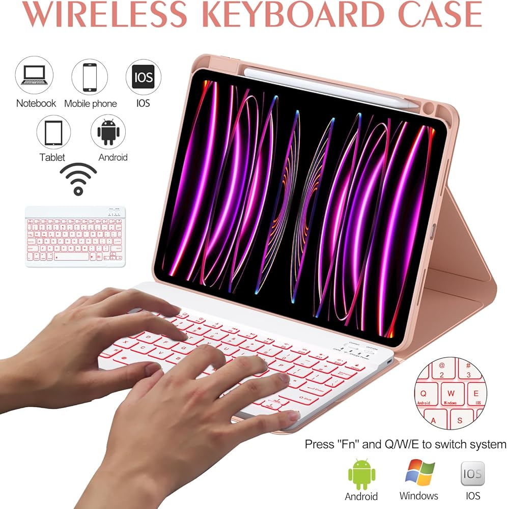 حالة لوحة مفاتيح Boboleee لـ iPad Air 11 بوصة M2 2024/iPad Pro 11 بوصة 4th/3rd/2nd/1st gen/10.9 بوصة Air 5th Gen ، الإضاءة الخلفية القابلة للفصل 7 ألوان لوحة المفاتيح ، غطاء لوحة مفاتيح Folio مع حامل القلم ، الوردي