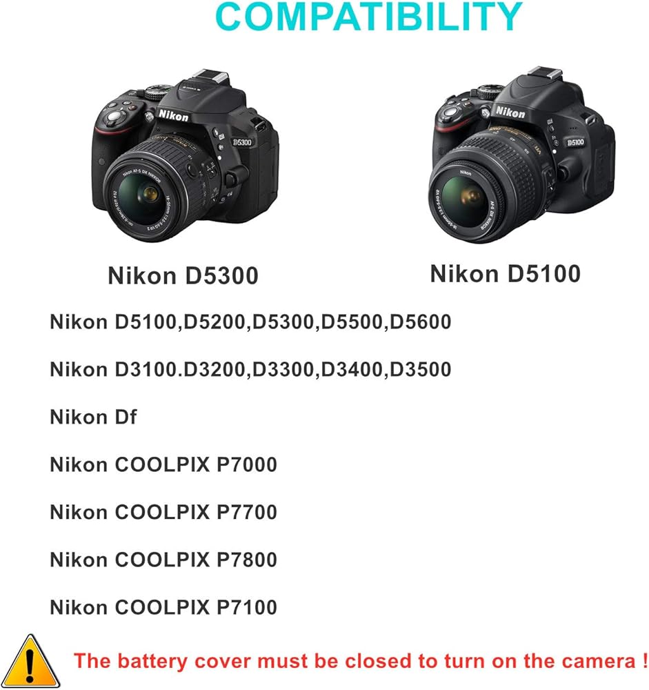 الموديلات المتوافقة: متوافقة مع كاميرات Nikon D5100 D5200 D5300 D5500 D5600 D3100 D3200 D3300 D3400 D3500 Df COOLPIX P7000 P7100 P7700 P7800. يرجى التحقق من صفحة تفاصيل المنتج للحصول على تفاصيل التكيف أو إرسال بريد إلكتروني إلى فريق خدمة العملاء لدينا للتشاور