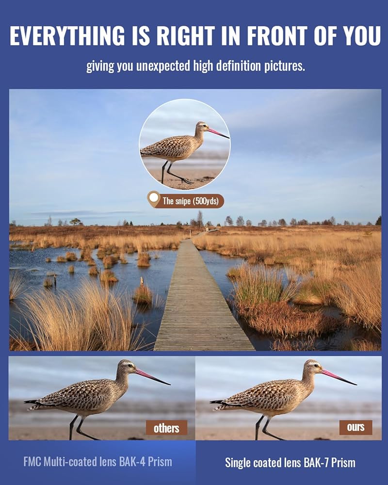 بصريات عالية الجودة ورؤية ليلية واضحة - يستخدم هذا المنظار عدسة BAK4 FMC، وتوفر العدسات شبه الكروية للفيلم FMC (متعددة الطلاء بالكامل) نقلًا فائقًا للضوء والتباين والجودة. ويمكن استخدامه في الليل، ولكن ليس في الظلام الدامس. مناسبة للحفلات الموسيقية والأوبرا ومشاهدة المعالم السياحية والمشاهدة الفلكية.