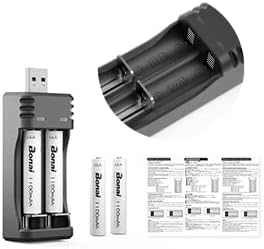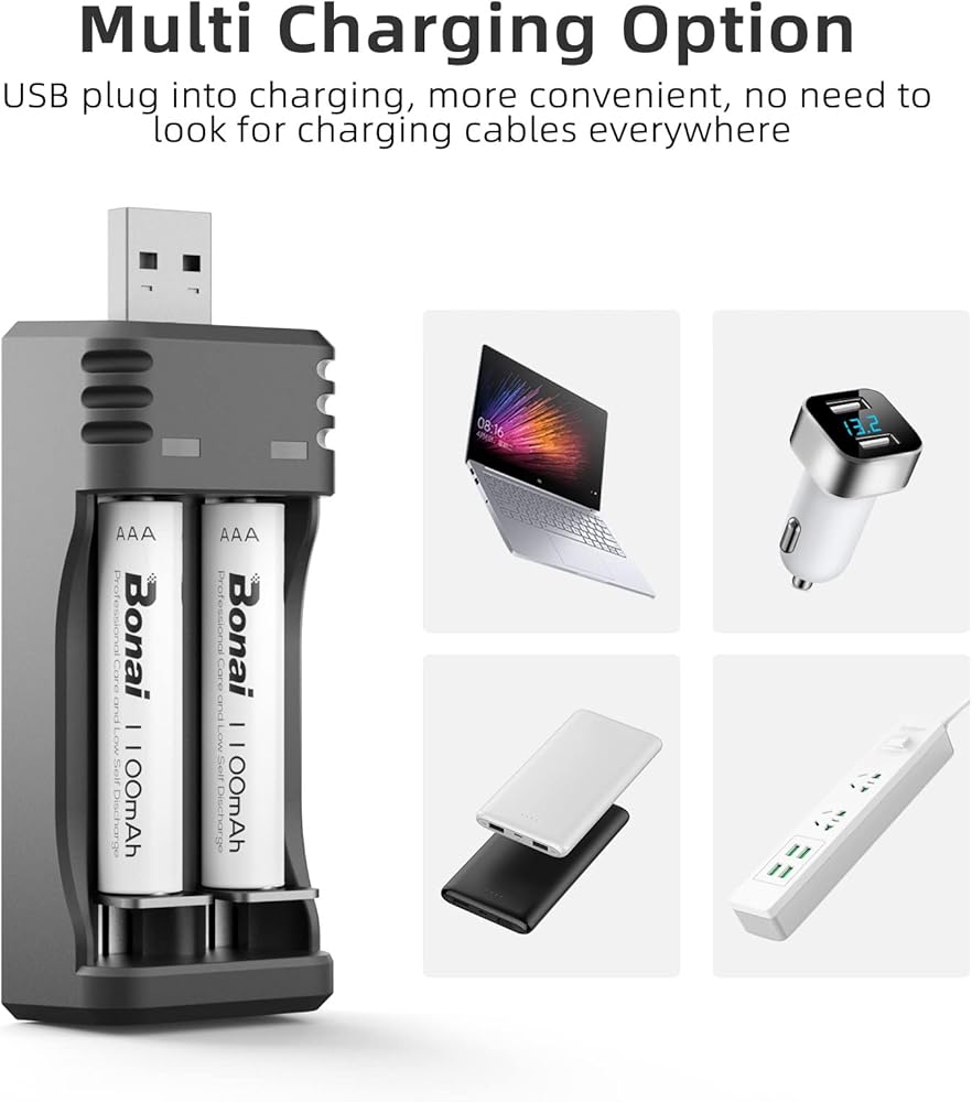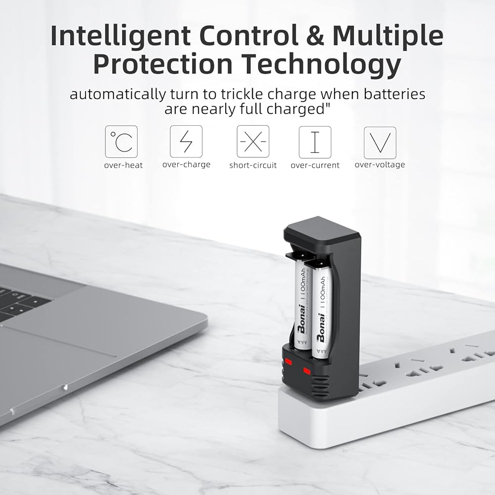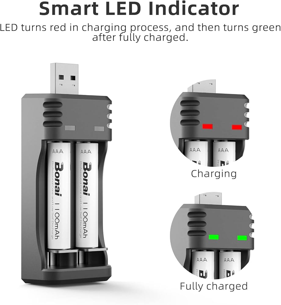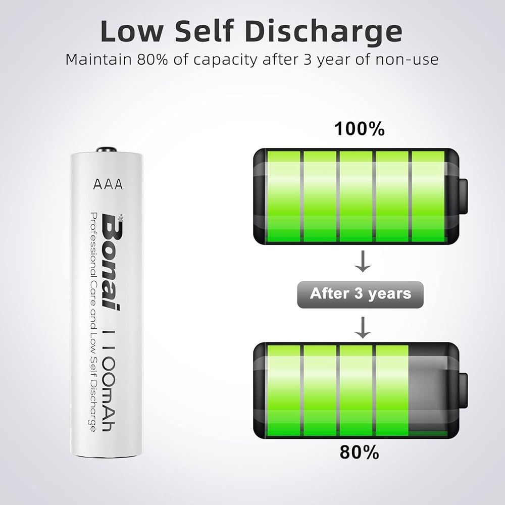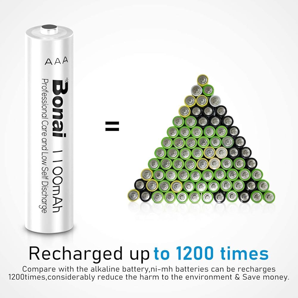 استمتع بالطاقة طويلة الأمد مع بطاريات AAA القابلة لإعادة الشحن بسعة 1100 مللي أمبير في الساعة، والتي تأتي مع شاحن LED مريح بفتحتين.