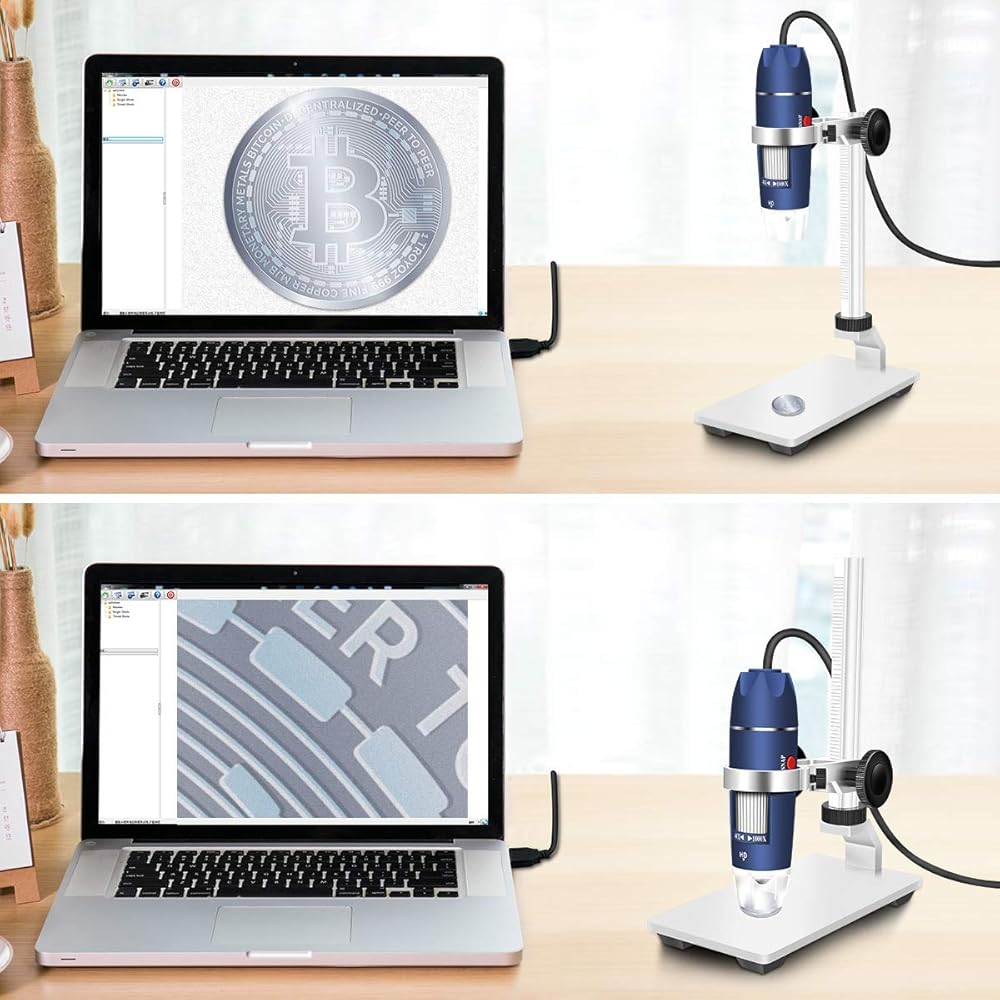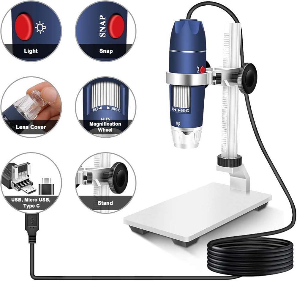 جيوشن HD 2MP USB المجهر الرقمي 40 1000X كاميرا مكبرة محمولة مع 8 مصابيح LED حامل مستقر من سبائك الألومنيوم لـ OTG Android Mac Windows 7 8 10 لينكس مع عدسة 2MP حقيقية دقة 1920x1080P و8 قطع LED قابلة للتعديل، مجهر جيوشن جيد للطلاب والأطفال والكبار للقيام بالعملات المعدنية ولوحة الدوائر الكهربائية والطوابع والبشرة والمجوهرات والشعر راقب الحشرات. وما إلى ذلك. مع حامل قابل للتعديل للارتفاع، يمكنك بسهولة تغيير الارتفاع عن طريق تدوير المقبض. مجهر جيوشن هو أيضًا مجهر محمول باليد. مع نوع موصل سي ميكرو يو إس بي، يمكنك استخدام المجهر على الهاتف الخلوي OG. يعمل المجهر أيضًا على ماك وويندوز ولينكس وكروم. هذا المجهر لا يعمل مع iPhone أو iPad. يمكنك أيضًا الحصول على حقيبة حمل محمولة، والتي يسهل عليك تخزين نطاقها أو حملها في الهواء الطلق.