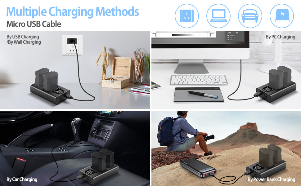 【شحن مريح】يحتوي الشاحن على منافذ إدخال Micro USB وType C، يمكنك الشحن أينما يوجد مقبس USB عن طريق التوصيل بجهاز الكمبيوتر أو شاحن سيارة USB أو شاحن حائط USB أو شاحن الهاتف أو بنك الطاقة. من السهل إعادة شحن البطاريات الخاصة بك في أي مكان وفي أي وقت وتوفير الكثير من الوقت. مثالية للسفر أو الأنشطة الداخلية والخارجية الأخرى.