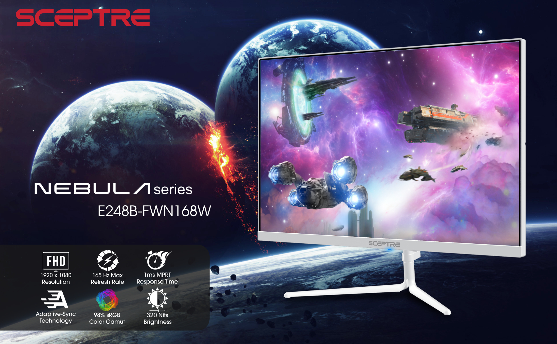 شاشة ألعاب LED FHD مقاس 24 انش 165Hz من نيبولا بدقة 1920 × 1080 FHD تصل إلى 165 هرتز ومعدل تحديث يصل إلى 1 مللي ثانية مع مزامنة تكيفية ام بي ار تي ومكبرات صوت مدمجة