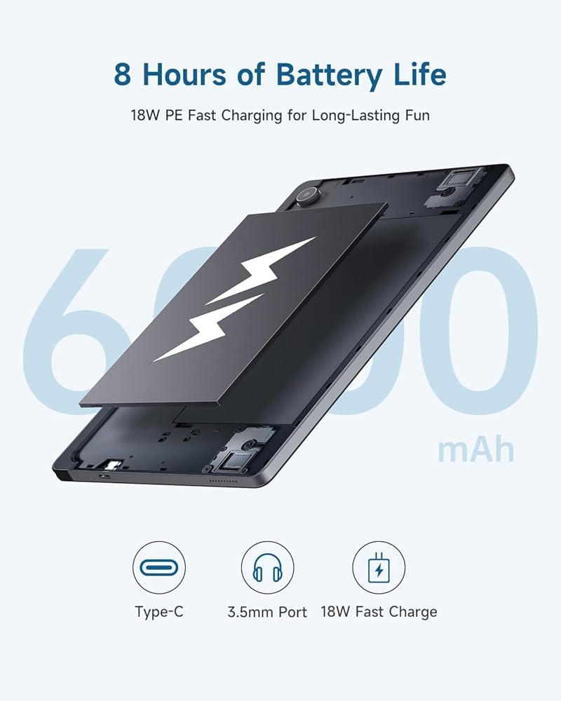 【𝟴 𝗛𝗢𝗨𝗥𝗦 𝗟𝗢𝗡𝗚 𝗕𝗔𝗧𝗧𝗘𝗥𝗬 𝗟𝗜𝗙𝗘 𝗮𝗻𝗱 𝗙𝗔𝗦𝗧 𝗖 𝗛𝗔𝗥𝗚𝗘】بطارية بقدرة 6000 مللي أمبير في الساعة تتيح ما يصل إلى 8 ساعات من تصفح الويب وما يصل إلى 6 ساعات من تشغيل الفيديو. قد يختلف عمر البطارية حسب بيئة الشبكة وأنماط الاستخدام وعوامل أخرى. تم تجهيز تابلت iPlay 50 Pro Max بشاحن 5V 2A وشحن سريع USB C 18W PE لمتعة تدوم طويلاً.
