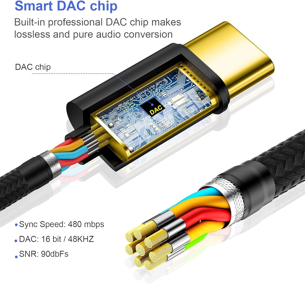 رقاقة DAC للحصول على جودة صوت فائقة: USB C إلى Aux Audio Dongle مدمج مع شريحة DAC قوية تسمح بجودة صوت Hi-Fi تصل إلى 96 كيلو هرتز - 24 بت. يتميز المنفذ الأنثوي مقاس 3.5 ملم بسطح مطلي بالذهب السميك يضمن نقل صوت ثابتًا وخاليًا من العيوب مع الحد الأدنى من فقدان الجودة.