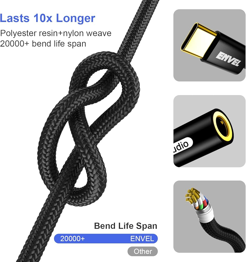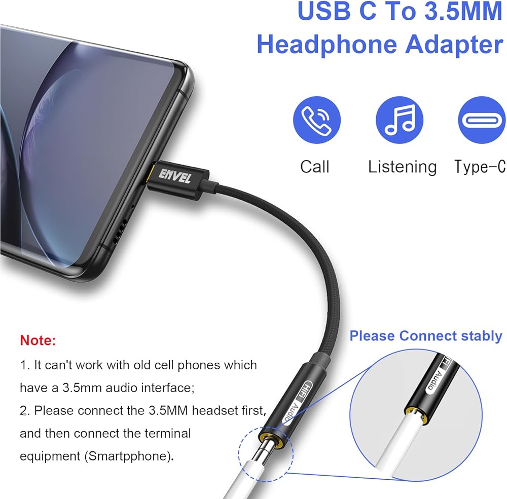 كابل ستيريو من النوع C إلى 3.5 مم: تم تصميم محول سماعة الرأس ENVEL USB C إلى 3.5 مم خصيصًا لهاتفك الذكي USB C الجديد بدون مقبس صوت لسماعات الرأس. يمكنك متابعة وظائف التحكم في مستوى الصوت والإيقاف المؤقت والتشغيل دون فتح قفل هاتفك.