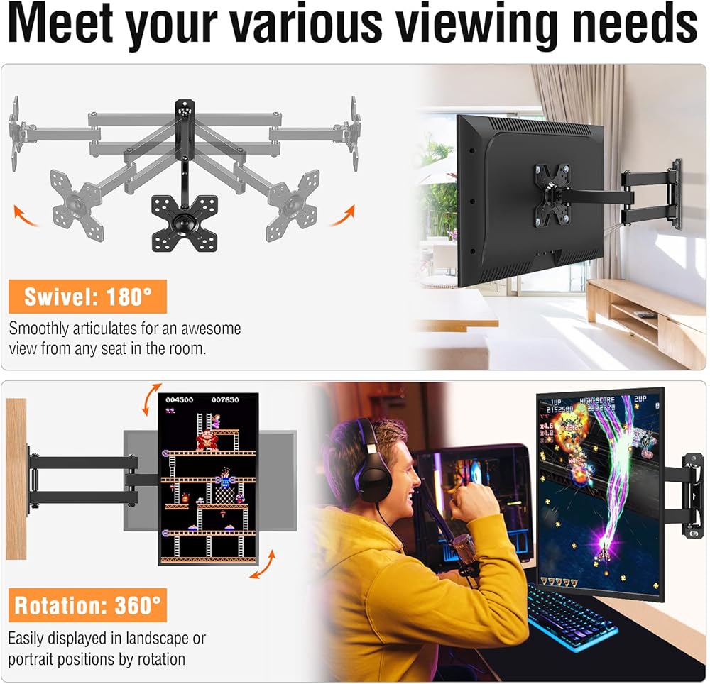 [مشاهدة التلفاز بشكل أكثر راحة] مع حامل تلفاز YD2004 كامل الحركة، يمكنك تدوير التلفزيون بسهولة ± 90 درجة وإمالة ±15 درجة. تمديد 37.7 سم من الحائط يسمح لك بألا تفوت لحظة من اللعبة.
