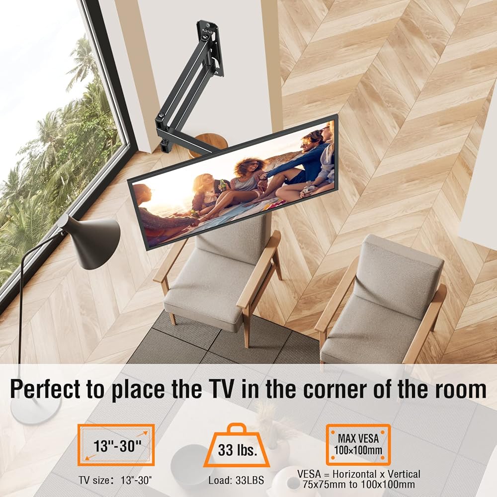 مع إمالة +/-15 درجة، دوران 180 درجة، تعديلات دوران 360 درجة، يسمح لك حامل التلفزيون كامل الحركة بتثبيت التلفزيون في زاوية والتأكد من مشاهدة التلفزيون بزاوية مريحة. يمكن لحامل الشاشة تمديد التلفزيون 14.8 بوصة ويحمل التلفزيون 2.2 بوصة من الحائط، مما يوفر مساحة أكبر للحفاظ على التلفزيون الخاص بك آمنًا من اصطدام الأطفال.
