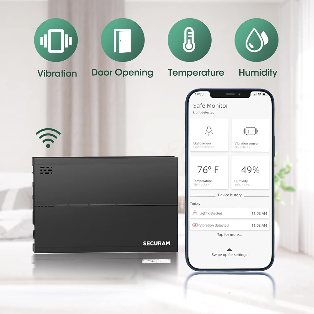تعد سيف مونيتور إضافة ذكية لأي خزنة أو تطبيق حيث يمكنك حماية أغراضك الثمينة الشخصية. يتم تثبيت الشاشة الآمنة داخل الخزنة وتتصل بشبكة الواي فاي المنزلية. يبلغ جهاز المراقبة الآمنة عن درجة الحرارة والرطوبة وحالة فتح الباب والاهتزاز إلى تطبيق سيكورام جارد.