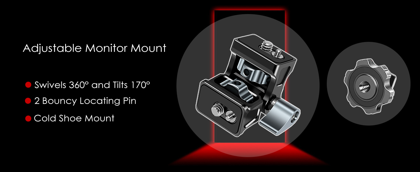 مرنة للغاية وقابلة للتعديل: يوفر حامل الشاشة الميدانية القابل للتعديل هذا دورانًا 360 درجة وإمالة 180 درجة، مما يسمح لك بإيجاد الزاوية المثالية لشاشتك والتقاط اللقطة المثالية. يمكنك بسهولة ضبط محور الإمالة بمقبض ليناسب الأوزان المختلفة، ويمكن تعديل إحكام كل محور باستخدام مفتاح ألين.