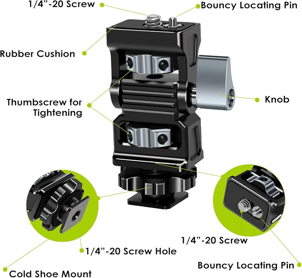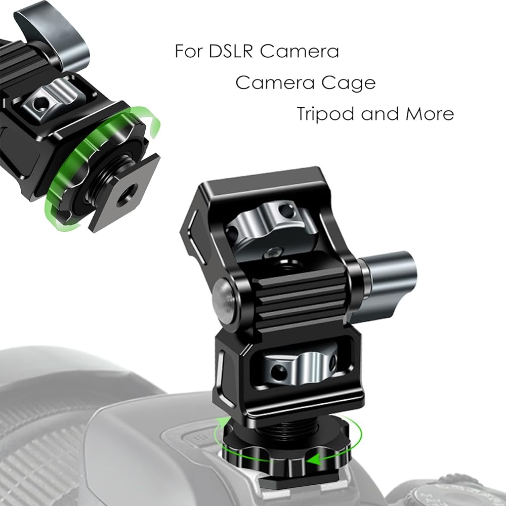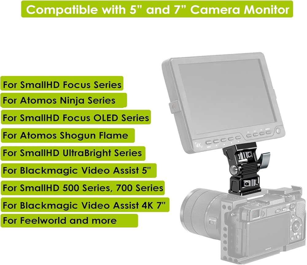استمتع بتوافق واسع مع محول الحذاء البارد الموجود في الأسفل، مما يسمح بسهولة الاتصال بقفص الكاميرا الخاص بك، وفتحة ملولبة 1/4 بوصة - 20 لتركيب ذراع سحري أو مثبت، ومسمار 1/4 بوصة - 20 على أعلى لدعم شاشة فيديو الكاميرا الخاصة بك مثل Feelworld/SmallHD/portkeys/Atomos والميكروفون والضوء والمزيد.