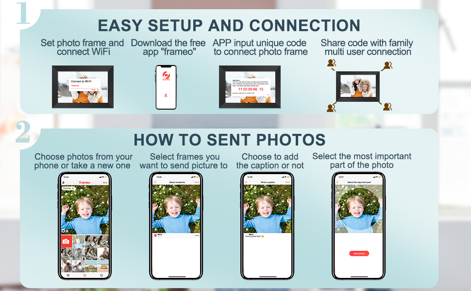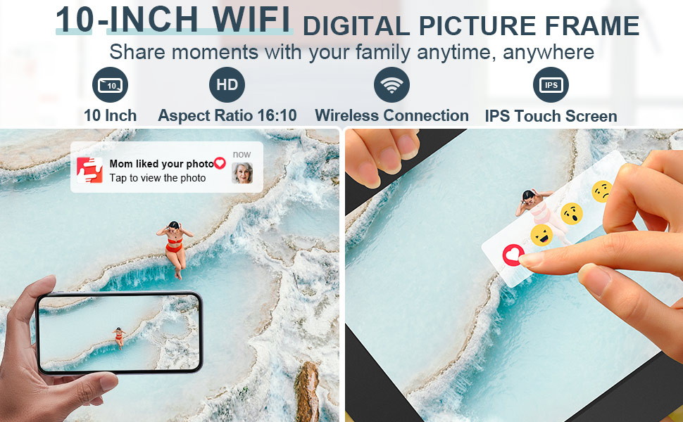 • 【هدية رائعة لتعزيز علاقاتك】الحياة طويلة. هناك لحظات مؤثرة لا حصر لها وأشياء لا تنسى في حياتنا. قد ننسى هذه الأشياء مع مرور الوقت، لكن الصور لا تزال تذكرنا بتجربتنا في ذلك الوقت. لذا، احفظ ذكرياتك الثمينة في إطار الصور الإلكتروني هذا! إذا كان لدى عائلتك أو أصدقائك أو حبيبتك هذا المنتج، فيمكنك إرسال صورك إلى إطارهم وسيقومون بتعليقاتك. إن مشاركة ما تفعله أمر رومانسي للغاية!