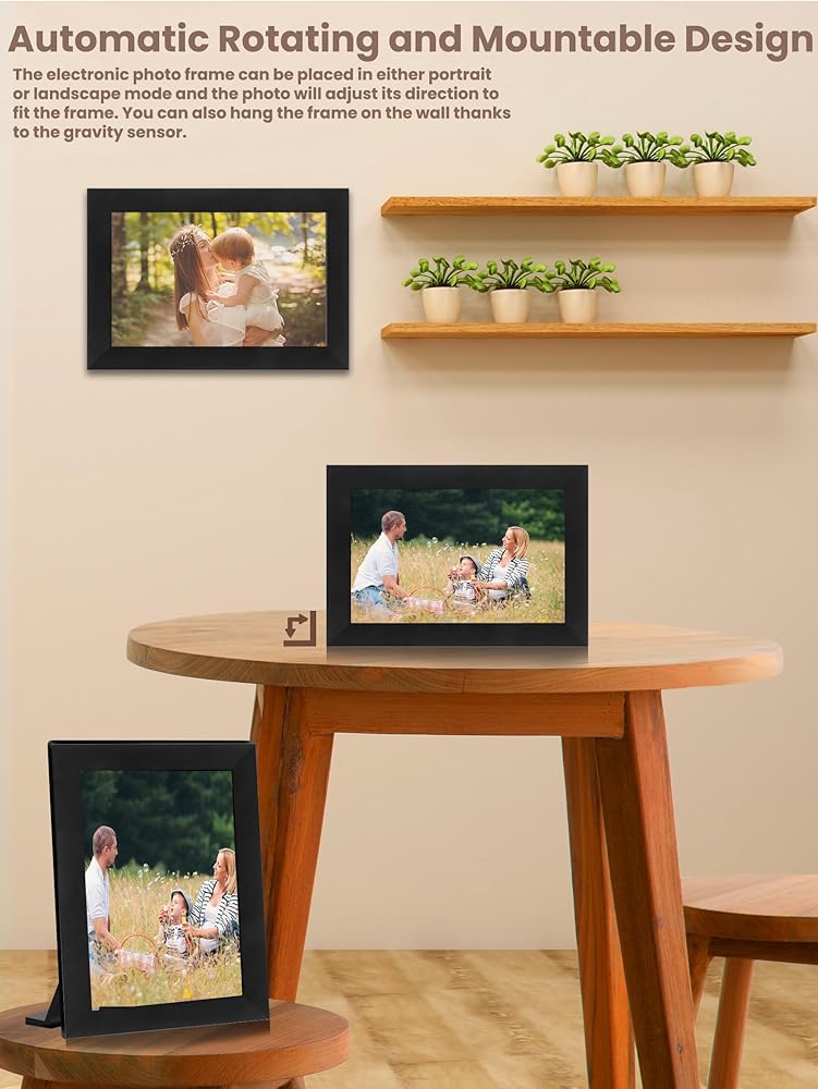 • 【تصميم يدور تلقائيًا وقابل للتثبيت على الحائط】يمكن وضع إطار الصورة الرقمي إما في الوضع الرأسي أو الأفقي وستضبط الصورة اتجاهها لتناسب الإطار. يمكنك أيضًا تعليق إطار الصورة الرقمي على الحائط بسبب التصميم القابل للتثبيت على الحائط، والذي يسمح لك برؤية لحظاتك المفضلة في أي وقت. لذا دع ذكرياتك الدافئة تضيف القليل من اللون إلى غرفتك!