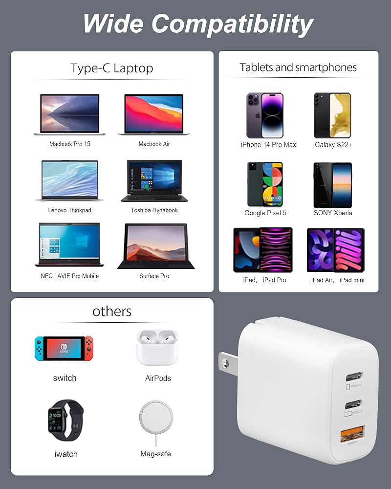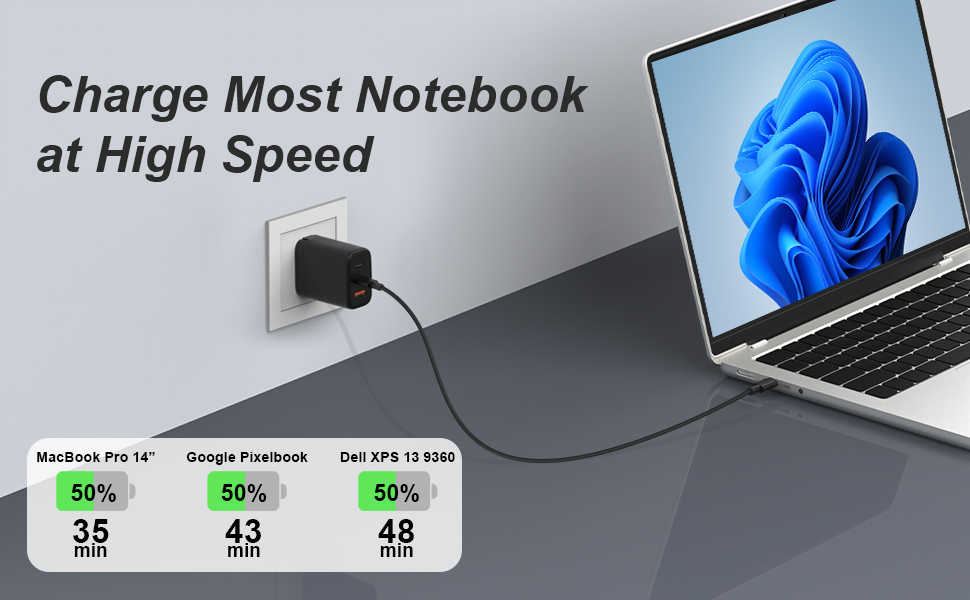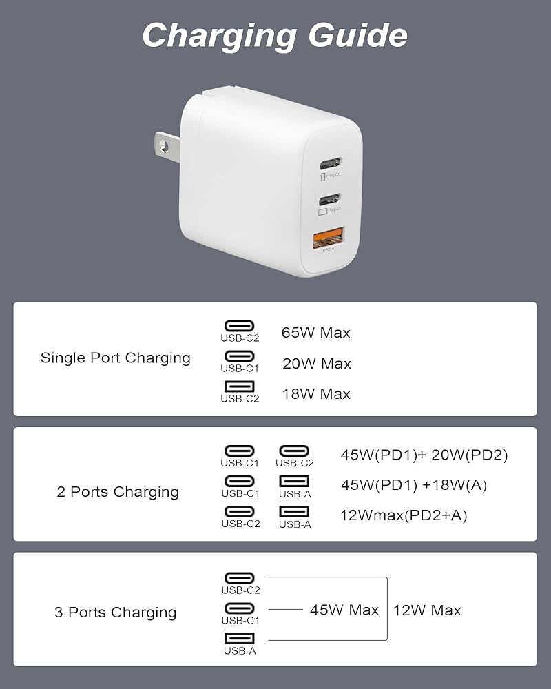 • توافق عالمي: شاحن USB C بقدرة 65 وات متوافق عالميًا مع مجموعة واسعة من الأجهزة. وهو يدعم بروتوكولات الشحن السريع مثل توصيل الطاقة (PD 3.0) والشحن السريع (QC 3.0)، مما يضمن أداء الشحن الأمثل لمختلف الأجهزة، وشحن أجهزة MacBook وipad وiPhone وSamsung Galaxy وGoogle Pixel والمزيد.